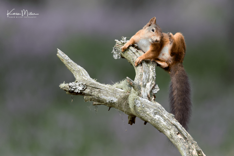I spent a wonderful day in Neil McIntyre‘s new red squirrel hide on the Rothiemurchas Estate in the Cairngorms. It’s set in Caledonian pine forest and when I was there in August the forest floor was covered in purple heather – stunning. I’m going to do a full blog on this soon, but in the meantime… just as I was packing up I spotted this little squirrel lying on a distant branch, probably exhausted after all the hazelnuts it had eaten throughout the day! I’d never seen this before and finally managed to find an angle unobstructed by other branches. I haven’t come across too many similar images (although I’m sure they exist!). Neil, who I consider to be “the squirrel guy” told me he’s never successfully managed to photograph this behaviour.