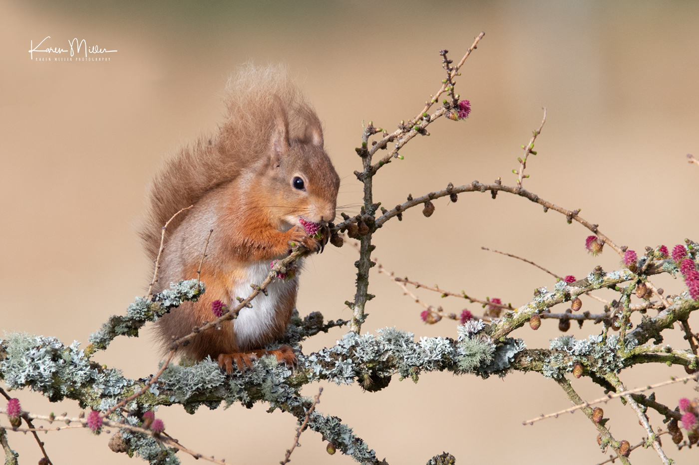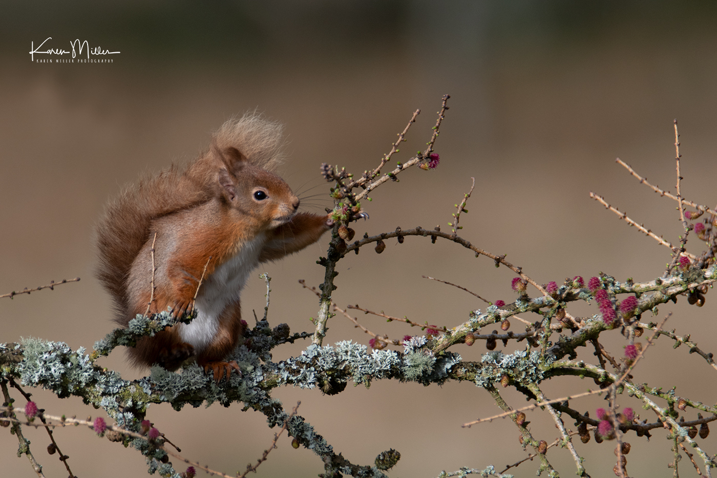 Later in the week I noticed that they were partial to the seeds of the larch tree flowers. Not always easy to photograph as there were a lot of little branches, but they are beautiful trees and on one morning a squirrel sat on a visible branch for ages munching the seeds providing me with some of my favourite photographs from the week. It’s lovely to see red squirrels eating food they’ve sourced, not the nuts I’ve provided (they did get through/cache a lot of hazelnuts too though!) What a joy to look out the window in the morning and see red squirrels!