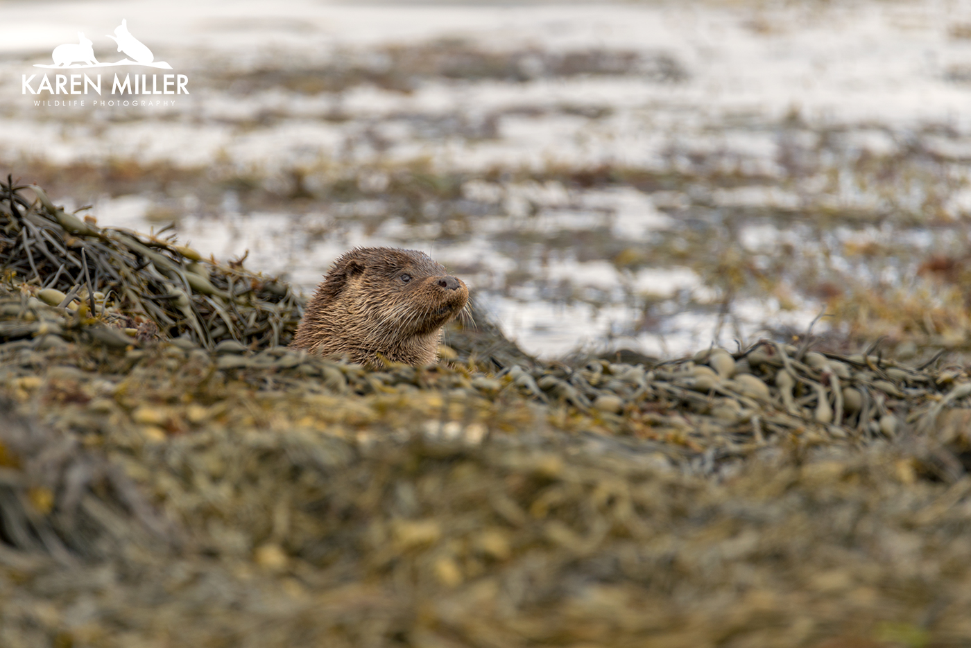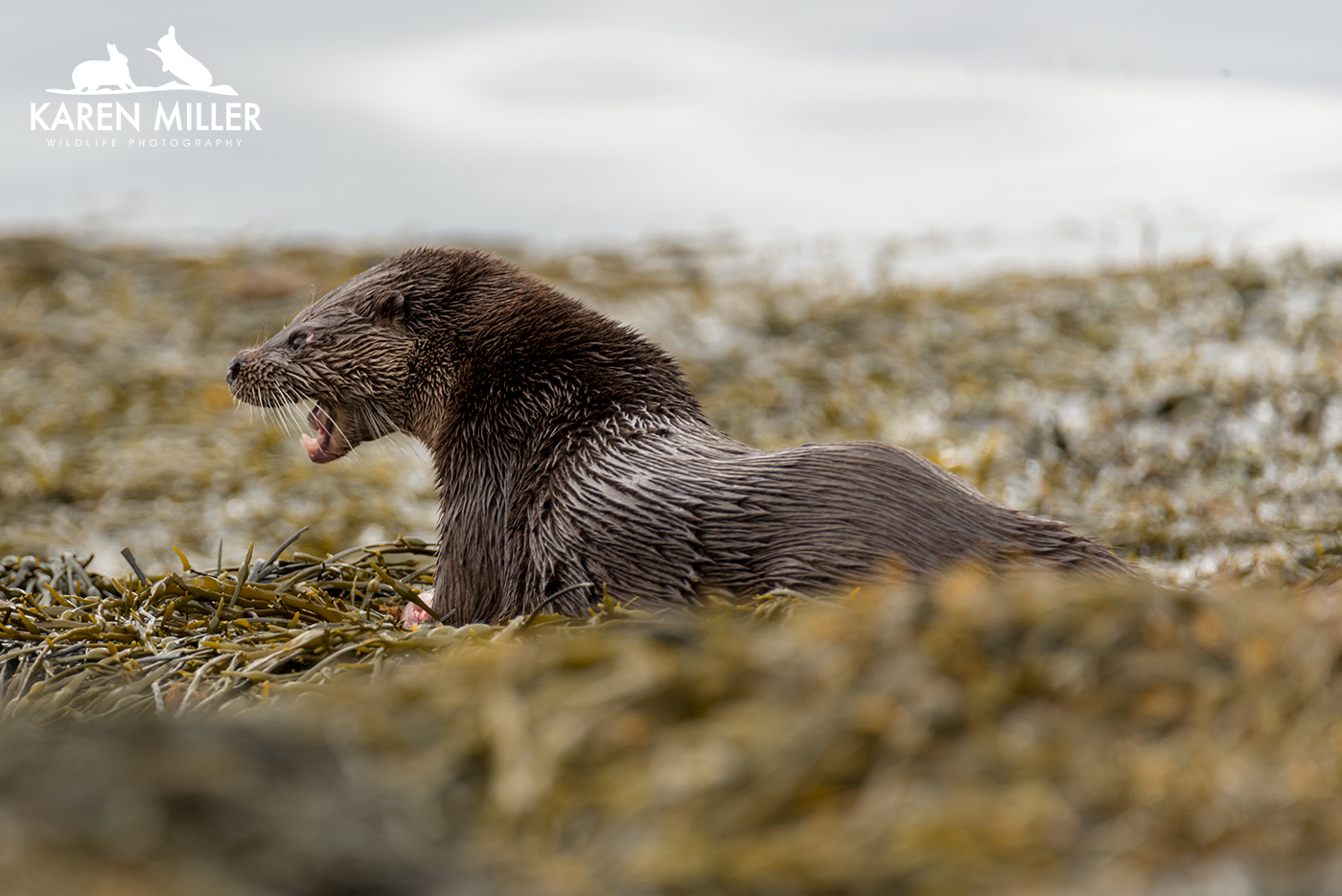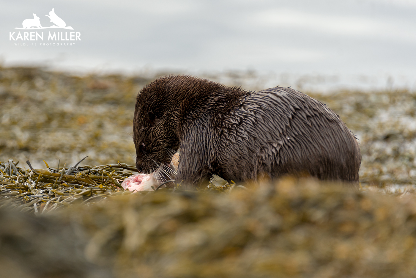 Finally, thanks to a tip from Jacqui of Enjoy Mull I found a mum and two cubs. These cubs must be about ready to leave home as they were pretty big. Again the conditions and bad luck meant I didn’t have a whole lot of success. As I arrived at their location they spotted me before I saw them and disappeared with some squeaking. I knew where they were (due to aforementioned squeaking) but couldn’t see so I settled down to await their reappearance. Suddenly the three of them were running towards me obviously heading inland to their holt. I sat still taking a couple of photos, but then as they got closer they realised I was there and shot back down into the water and swam round the shore. I felt bad that I’d spooked them, but I had no idea they’d come running at me! Again, great to see. So all in all it was a relatively good otter day, especially given the conditions which couldn’t really have been worse for otter photography.