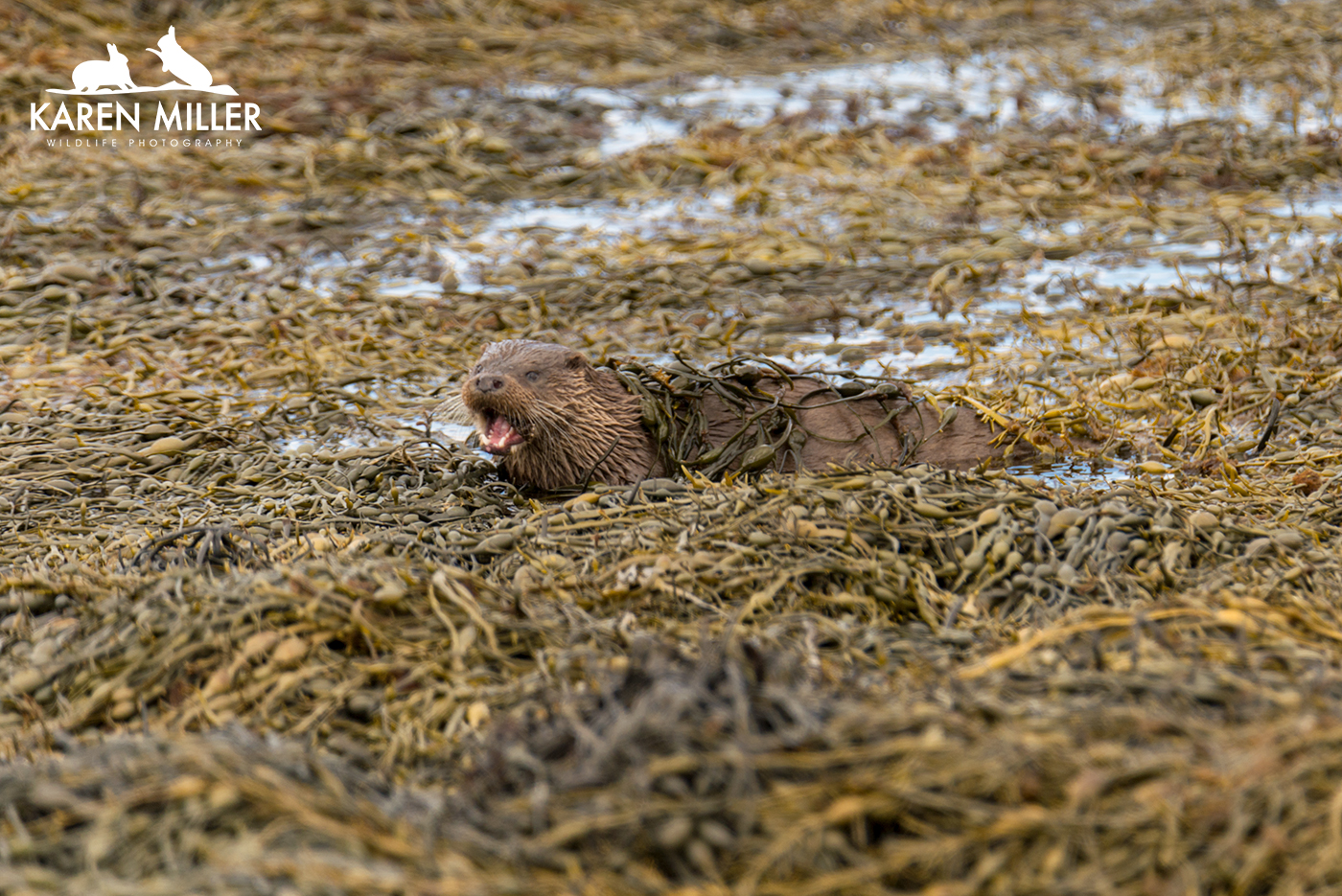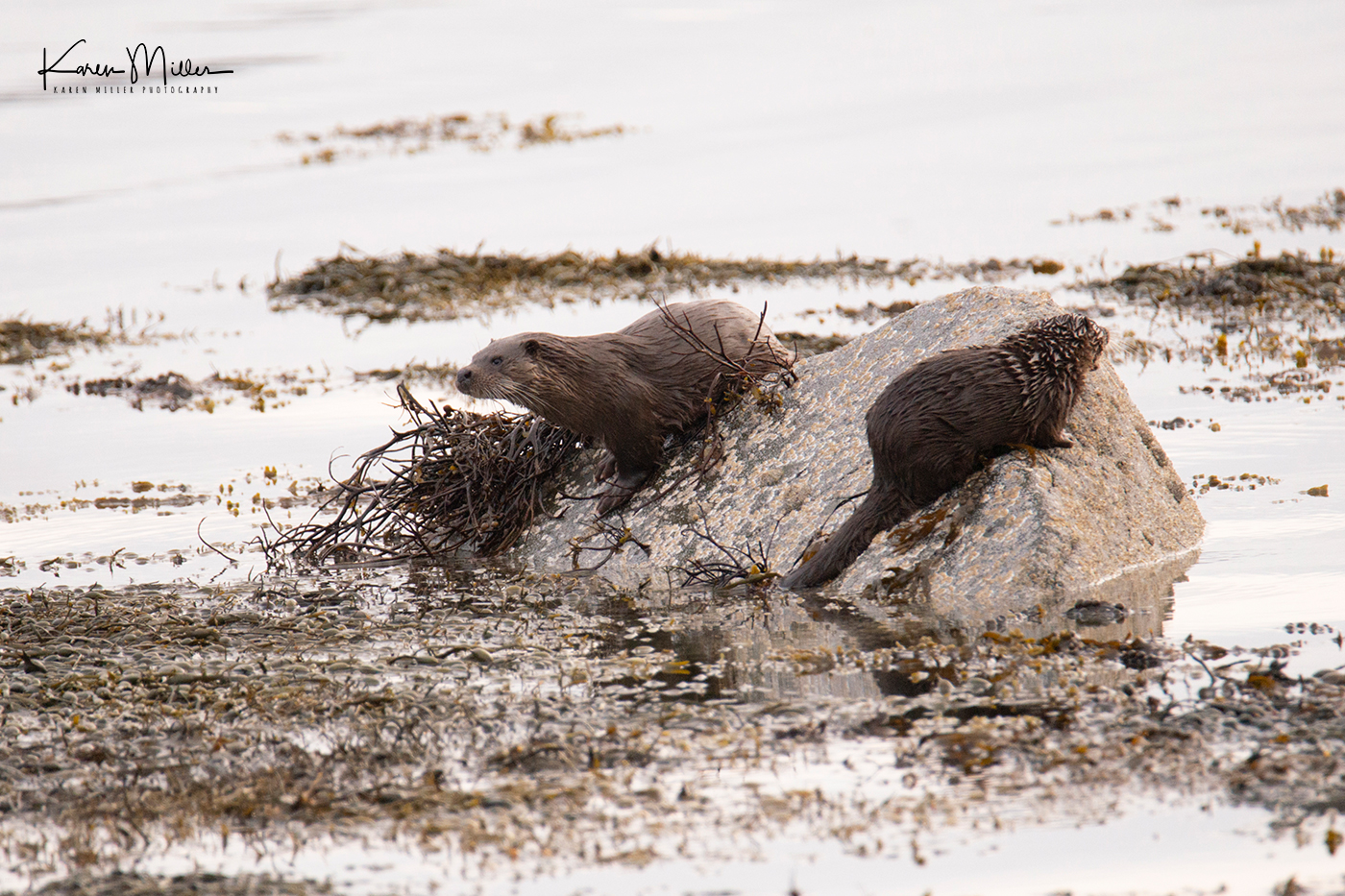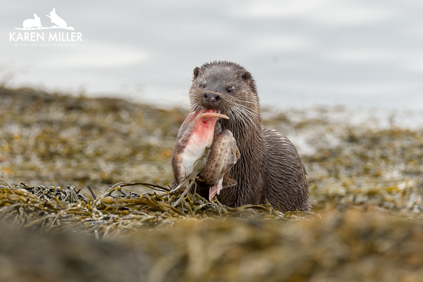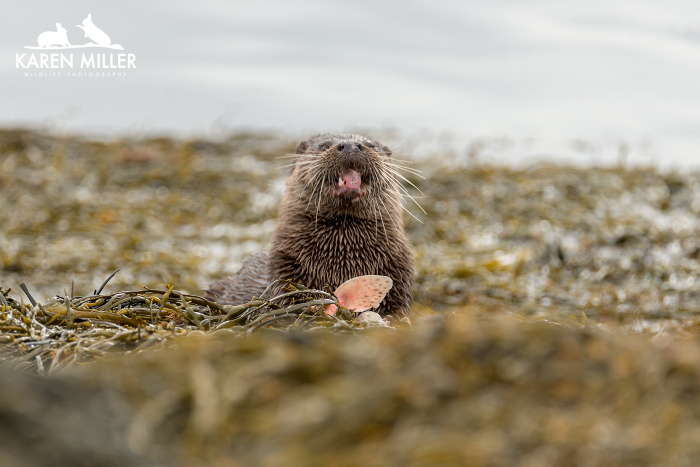 Finally, thanks to a tip from Jacqui of Enjoy Mull I found a mum and two cubs. These cubs must be about ready to leave home as they were pretty big. Again the conditions and bad luck meant I didn’t have a whole lot of success. As I arrived at their location they spotted me before I saw them and disappeared with some squeaking. I knew where they were (due to aforementioned squeaking) but couldn’t see so I settled down to await their reappearance. Suddenly the three of them were running towards me obviously heading inland to their holt. I sat still taking a couple of photos, but then as they got closer they realised I was there and shot back down into the water and swam round the shore. I felt bad that I’d spooked them, but I had no idea they’d come running at me! Again, great to see. So all in all it was a relatively good otter day, especially given the conditions which couldn’t really have been worse for otter photography.