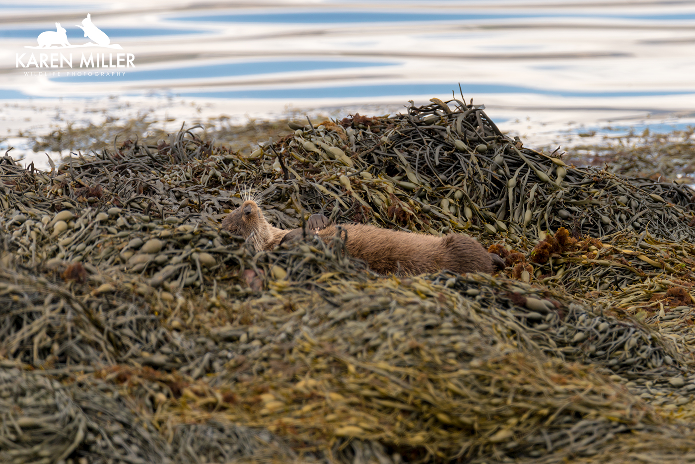 I stopped further round the loch and sat for a while as I knew otters had been spotted here. Eventually I saw one, again far out, fishing. I tracked this one as it zigzagged back and forth, always out at sea. Finally it came in, but frustratingly just at that moment someone who lived shore-side decided to do a mass of recycling and the calm conditions meant the sound carried and spooked the otter, so it was back to tracking it again. Next time it came ashore a car stopped with engine running, opened the window and the people started talking. Bye bye otter… I found it again a wee while later and this time was able to get relatively close. But luck wasn’t with me. It went into a dip in the rocks, rolling about in the seaweed and grooming. All I saw was the odd paw, the tail or head every so often! I eventually moved round, taking great care to make no noise, and caught the end of the groom, but then it moved on. Sigh…