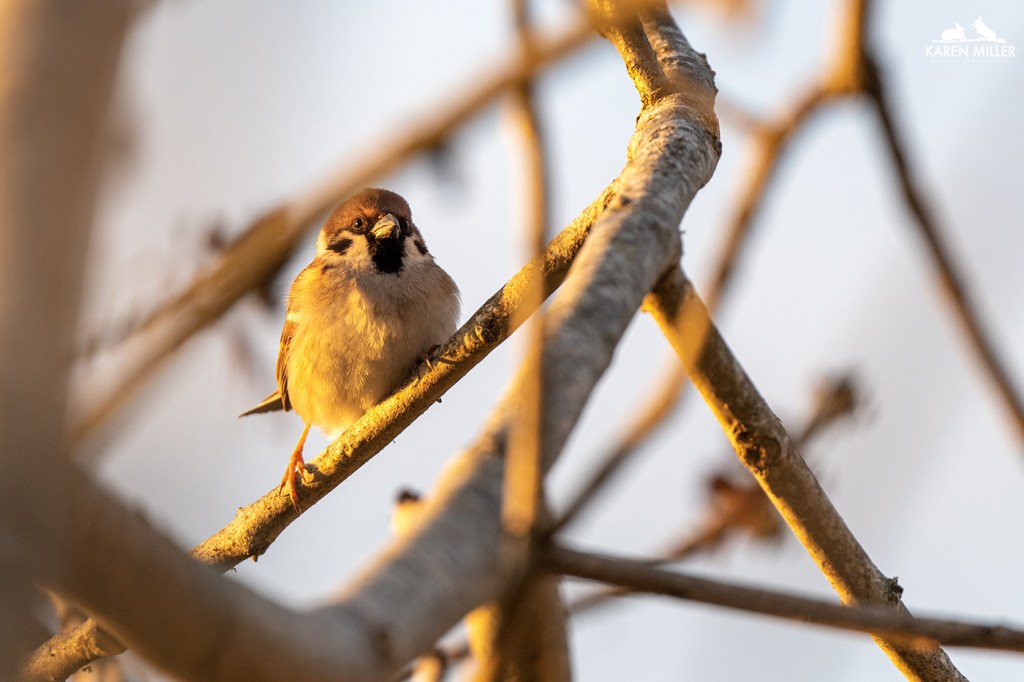 The tree sparrows seem to converge on the grain field in front of the house, there were lots there – not too photogenic though, so here’s one in a tree