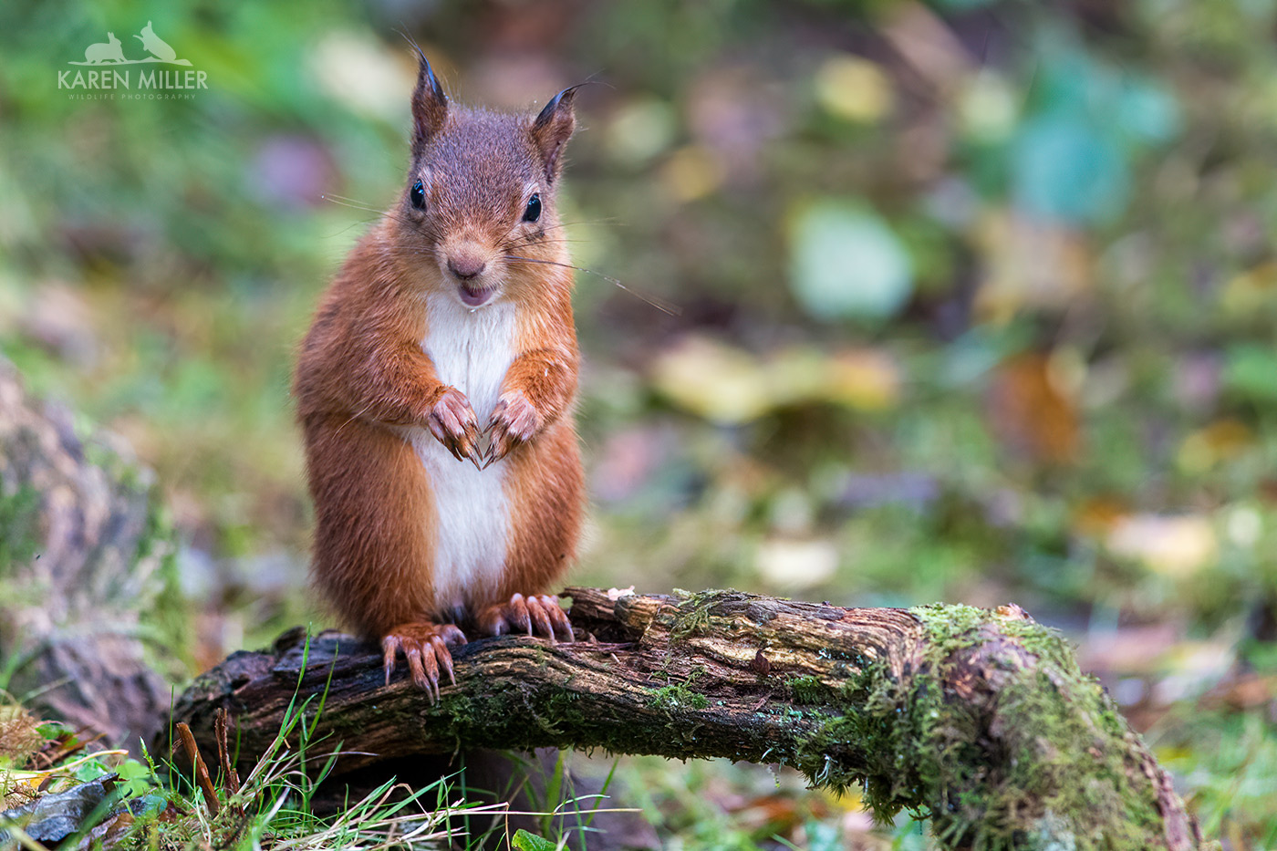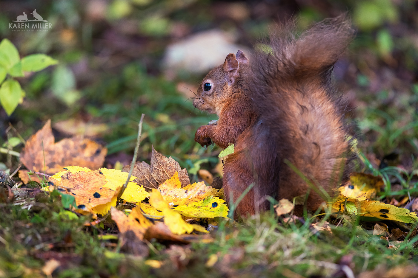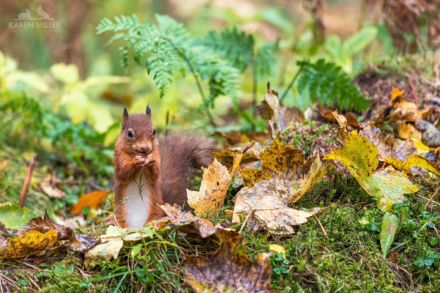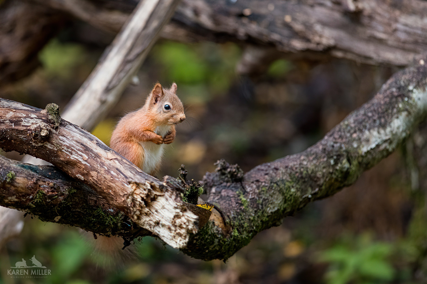 My red squirrel site is situated in deciduous woodland, there’s oak, sycamore, ash, beech, rowan and birch as well as a whole lot of bracken in the summer. Partly due to where I put it the light all summer has been challenging but now, with leaves falling and bracken dying back it’s beginning to improve and I’ve been able to switch from f2.8 aperture lenses to f4 which is good because my 300mm F2.8 is a beast and I can’t leave my tripod in the hide because the mice eat it (it’s looking a little worst for wear…)