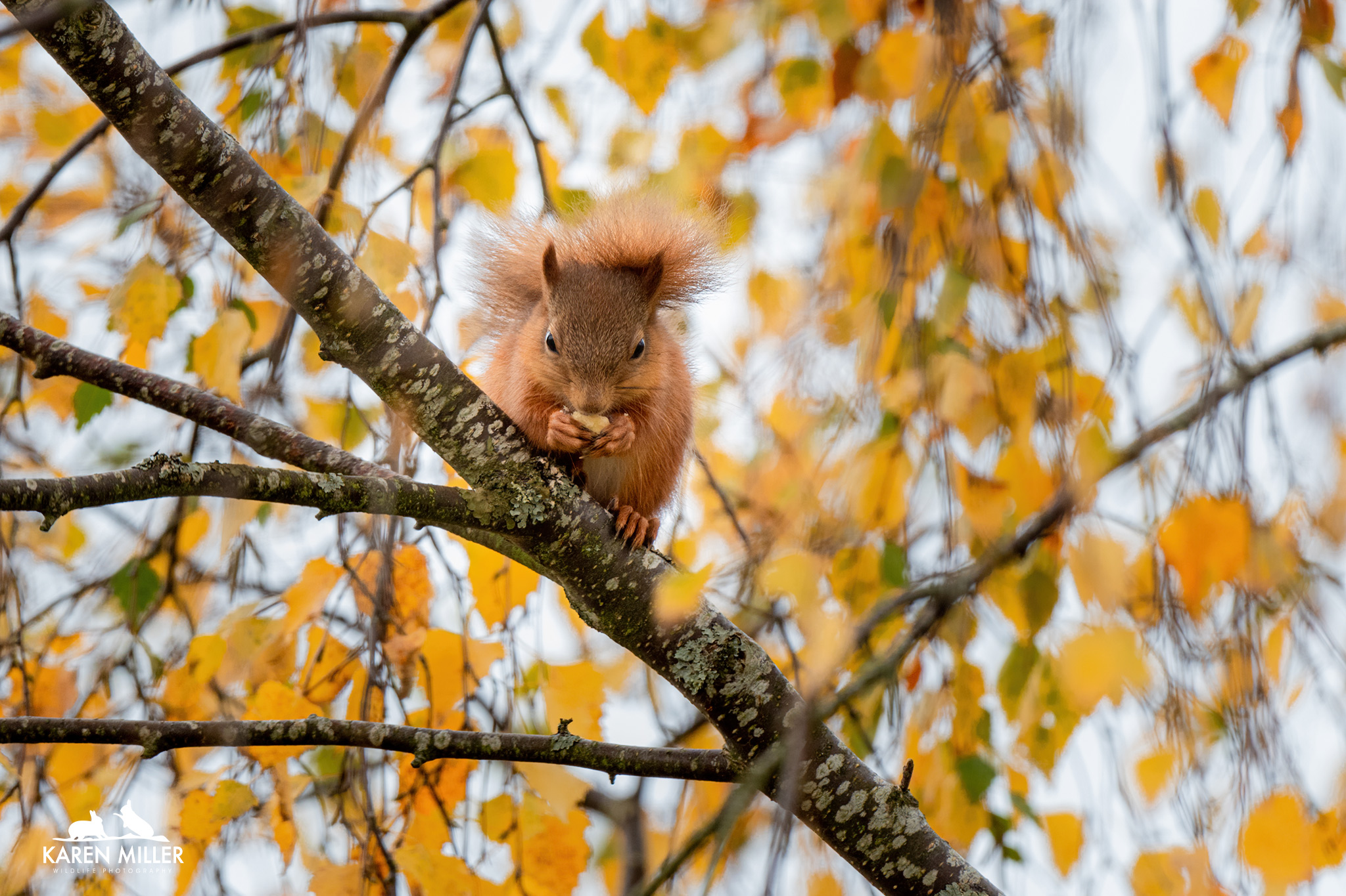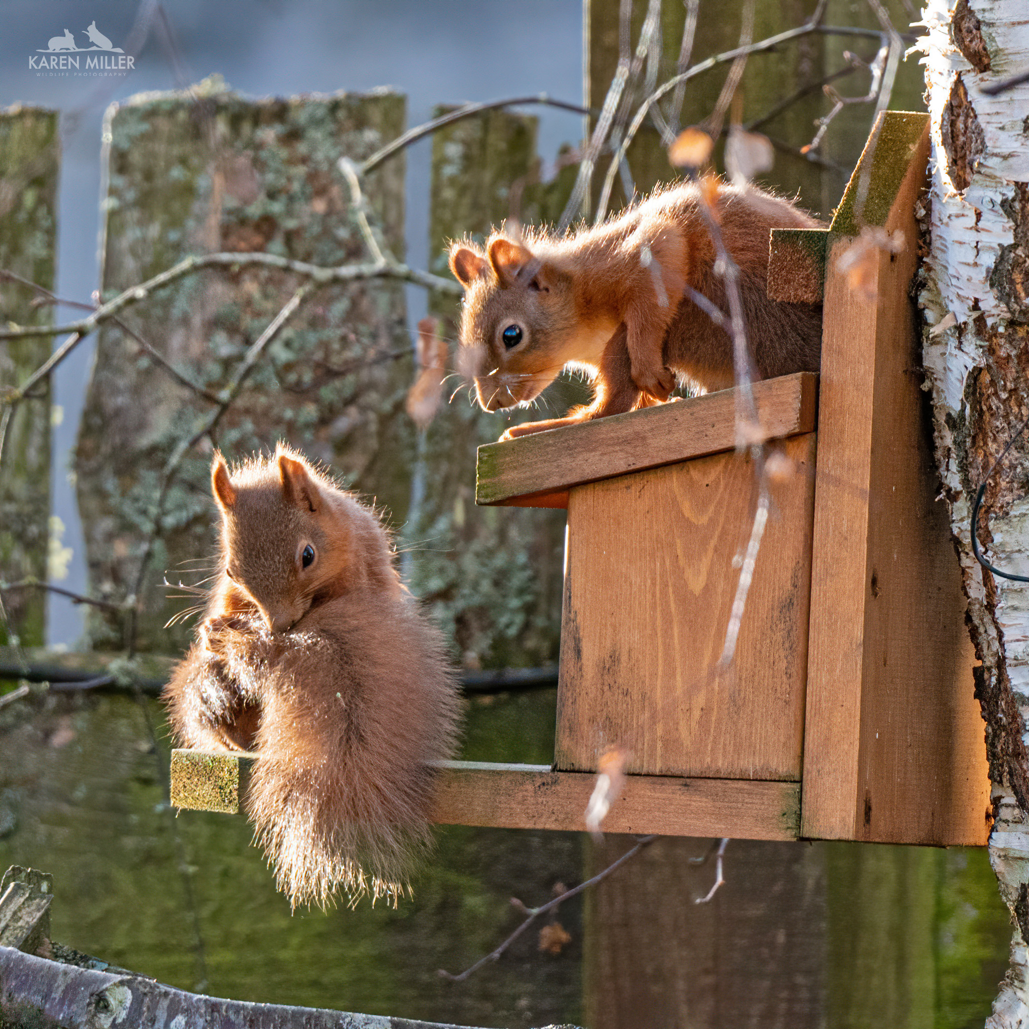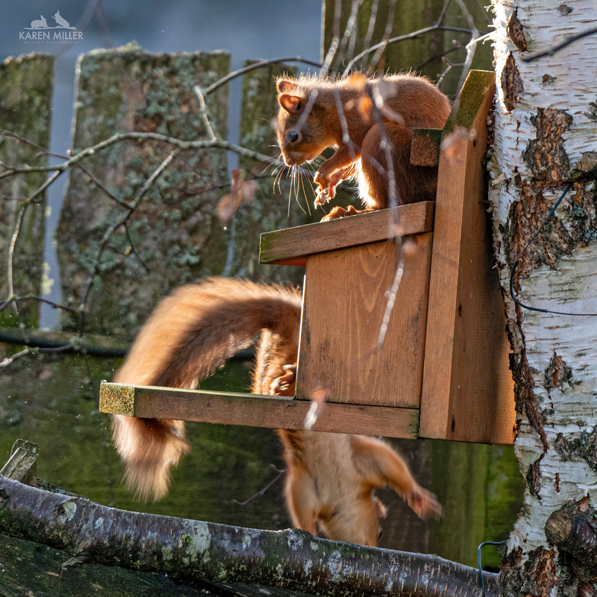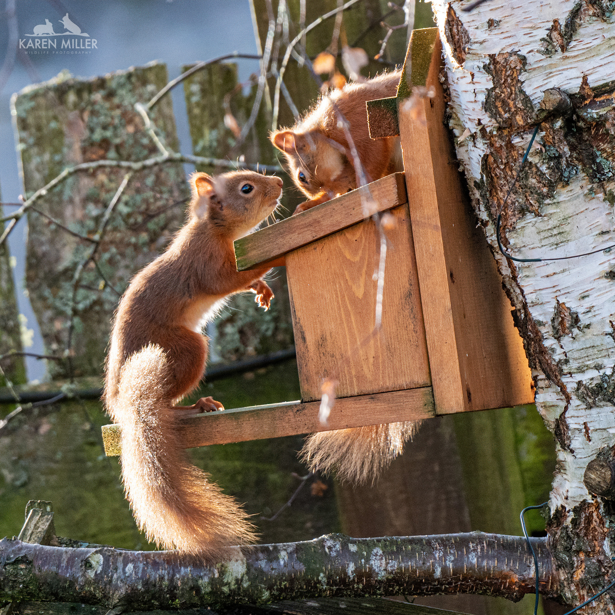 I went and sat by the fence and suddenly spotted two squirrels in the birch tree which has sadly dropped most of its leaves over the past couple of days. I presumed it was a kitten and Louis, but it transpired it was the two kittens. Up until this point I’d been pretty certain there were two youngsters but didn’t have definitive proof, so I was delighted to discover I was right. However, what happened next was wonderful. The two little ones interacted together in beautifully intimate way before sitting close to each other for a groom.