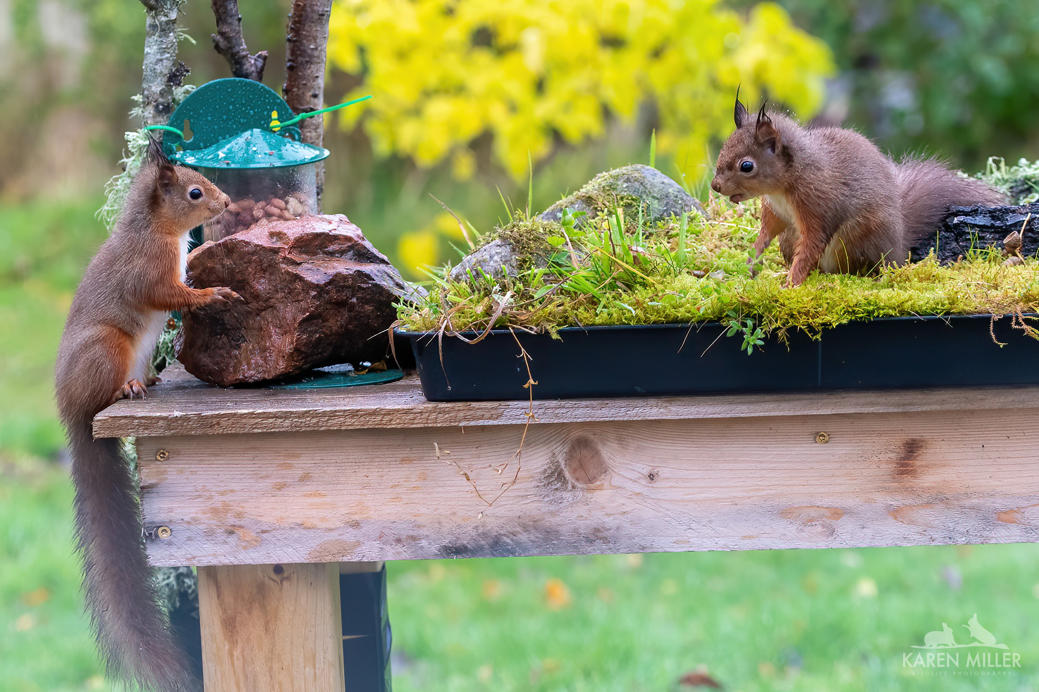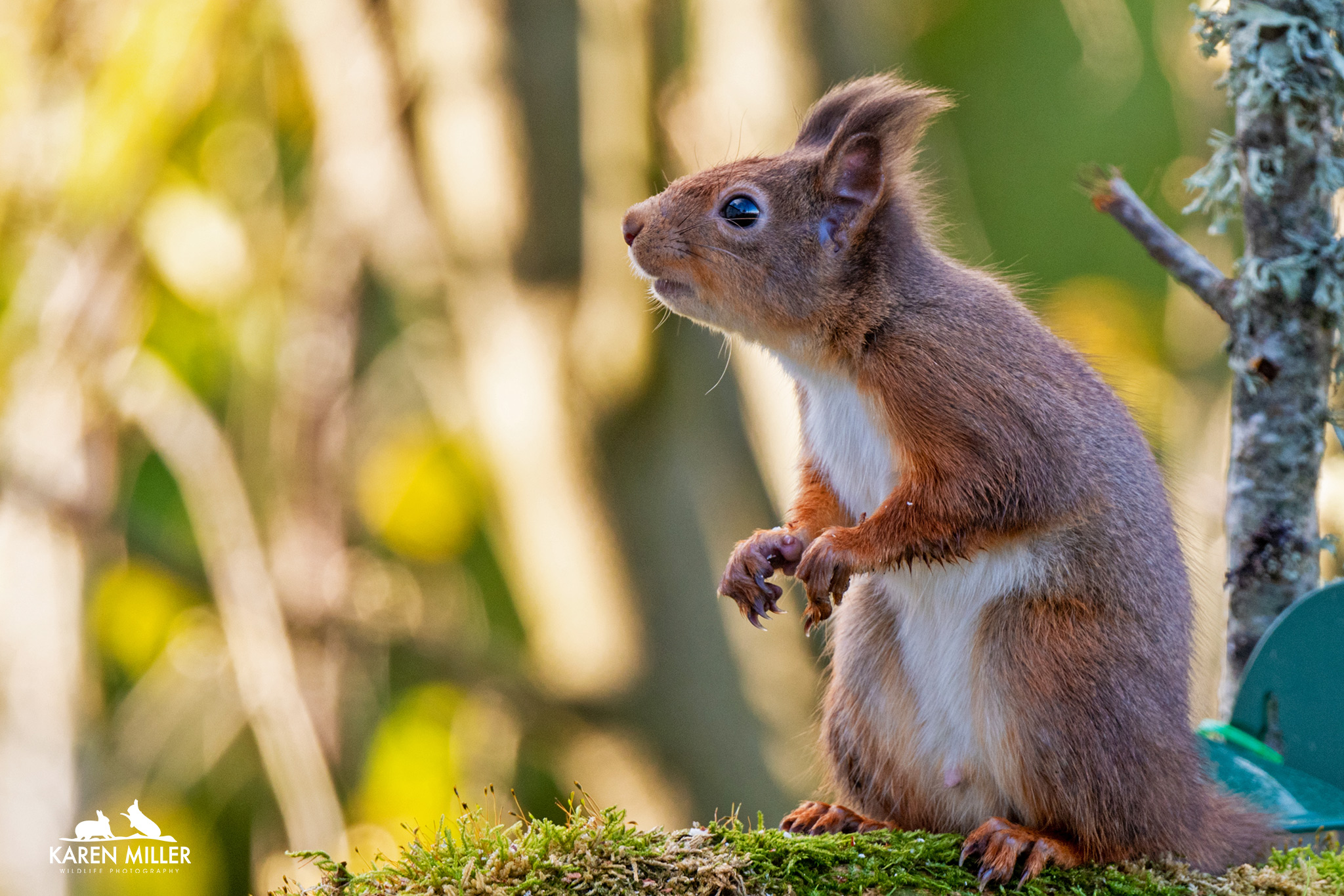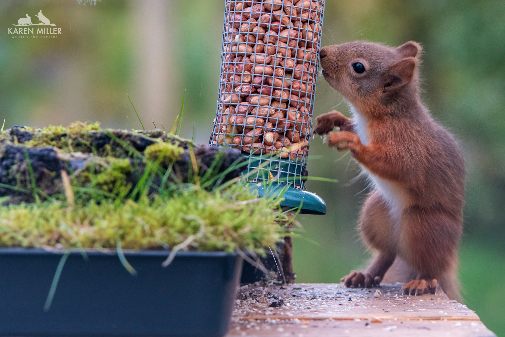 A while ago I created a table-top feeding area using a garden tray and some of the moss from my lawn (I have more moss than grass). I added a couple of mossy rocks and some bark I found in the woods and positioned it on a little table outside my kitchen window. I’m lucky in that the glass is ok for photographing through. The idea was of course to photograph the birds at (fake) eye-level. However it’s worked a treat for the squirrels with a few modifications. I’ve put branches up both sides for them to scamper up and down (the kittens had a bit of a struggle getting up sometimes). I can now sit in the comfort of my kitchen and watch/photograph them and they don’t seem to be disturbed by it. Fortunately Murphy, my dog, can’t see them unless he stands up or they have the temerity to go into his garden which can be seen through the patio doors – lots of barking ensues when that happens.