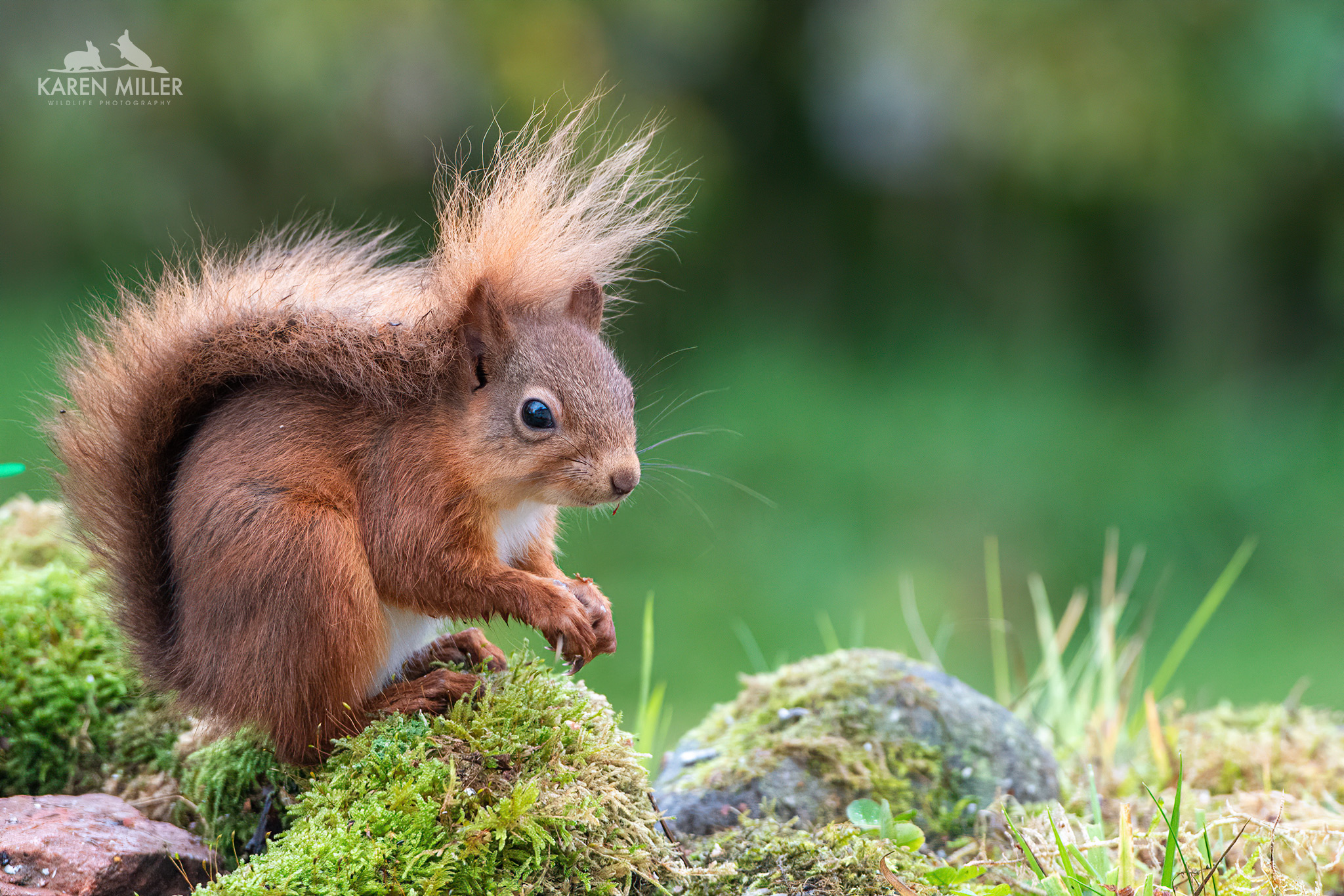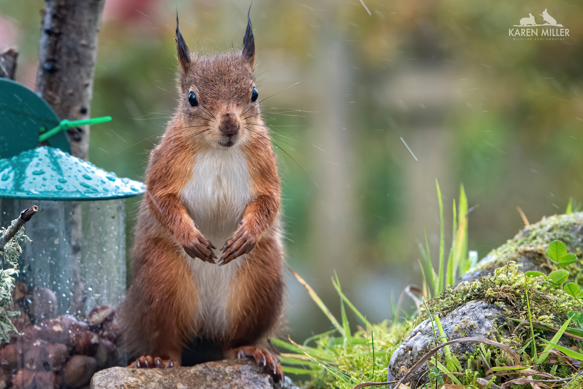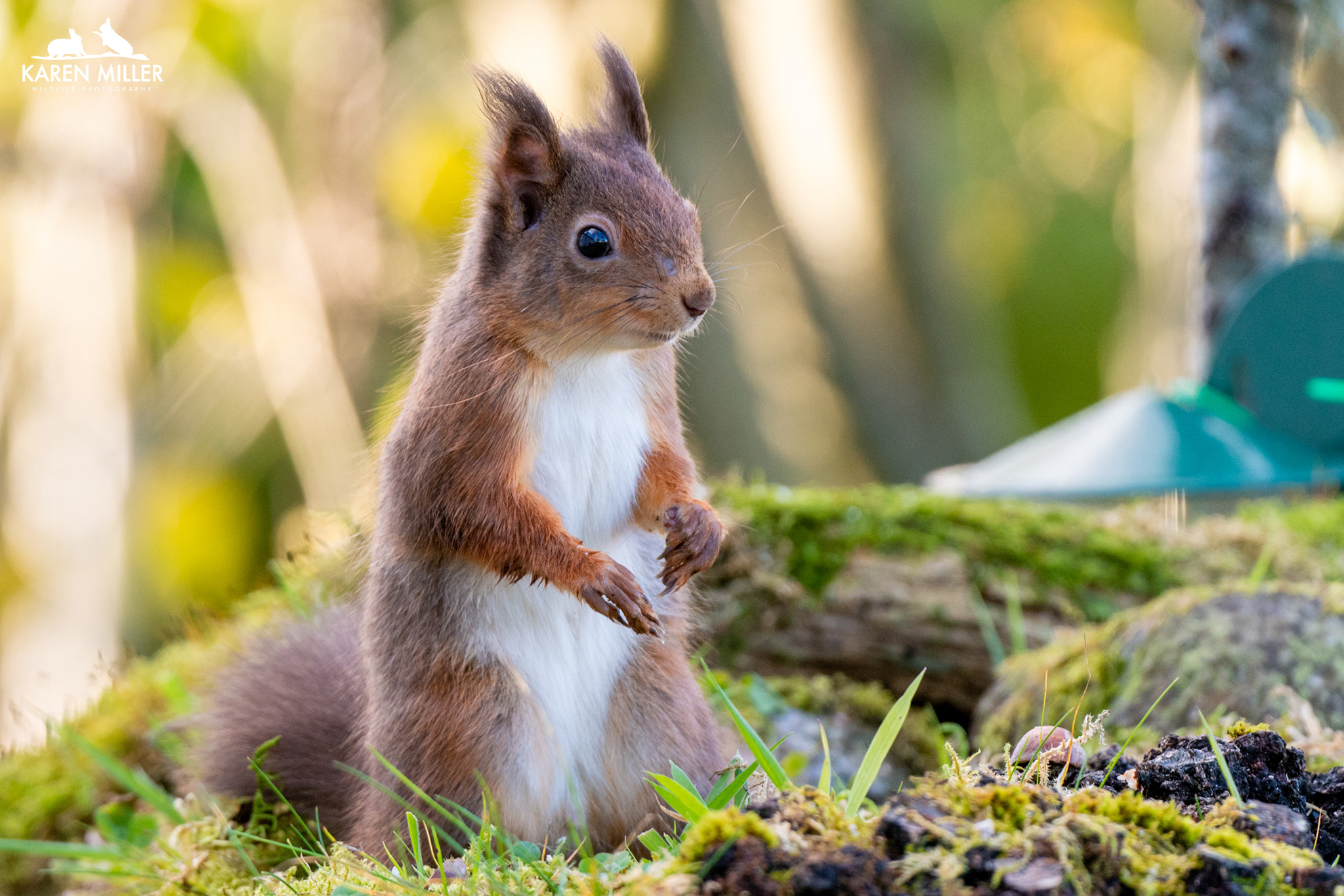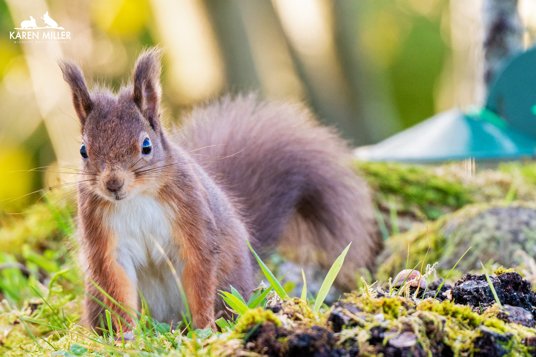 A while ago I created a table-top feeding area using a garden tray and some of the moss from my lawn (I have more moss than grass). I added a couple of mossy rocks and some bark I found in the woods and positioned it on a little table outside my kitchen window. I’m lucky in that the glass is ok for photographing through. The idea was of course to photograph the birds at (fake) eye-level. However it’s worked a treat for the squirrels with a few modifications. I’ve put branches up both sides for them to scamper up and down (the kittens had a bit of a struggle getting up sometimes). I can now sit in the comfort of my kitchen and watch/photograph them and they don’t seem to be disturbed by it. Fortunately Murphy, my dog, can’t see them unless he stands up or they have the temerity to go into his garden which can be seen through the patio doors – lots of barking ensues when that happens.