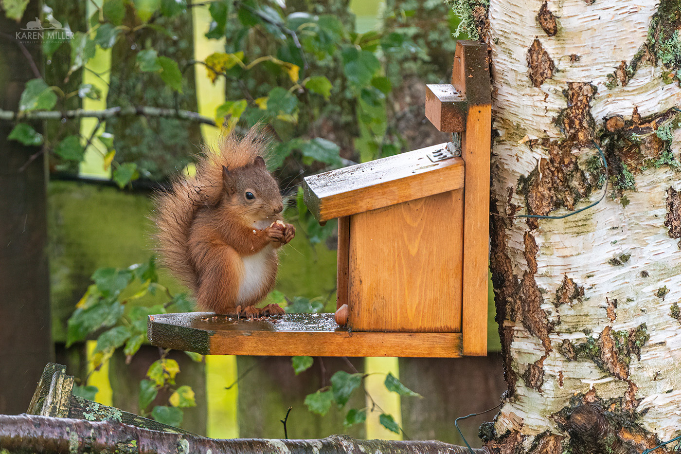 Over the past few days I’ve torn myself away from the kitchen window and visited the woodland squirrels. I’ve been sitting outside the hide to try and get them used to me and it’s worked amazingly well. That’s for my next blog though. Buoyed by my success I thought I’d see how the garden squirrels felt about seeing me. It wasn’t as successful sadly and only Louis ventured to the feeder although he was a bit wary, as I skulked at the edge of the house (I have gravel around three sides which makes creeping up on wildlife nigh on impossible). The views of my feeding table weren’t as photogenic, but it was more about finding out how the squirrels would cope with shutter noise etc.