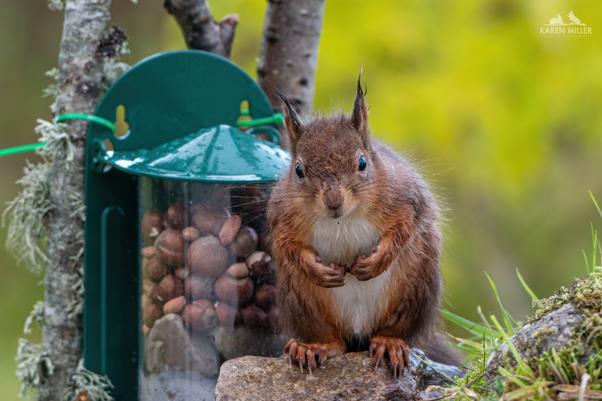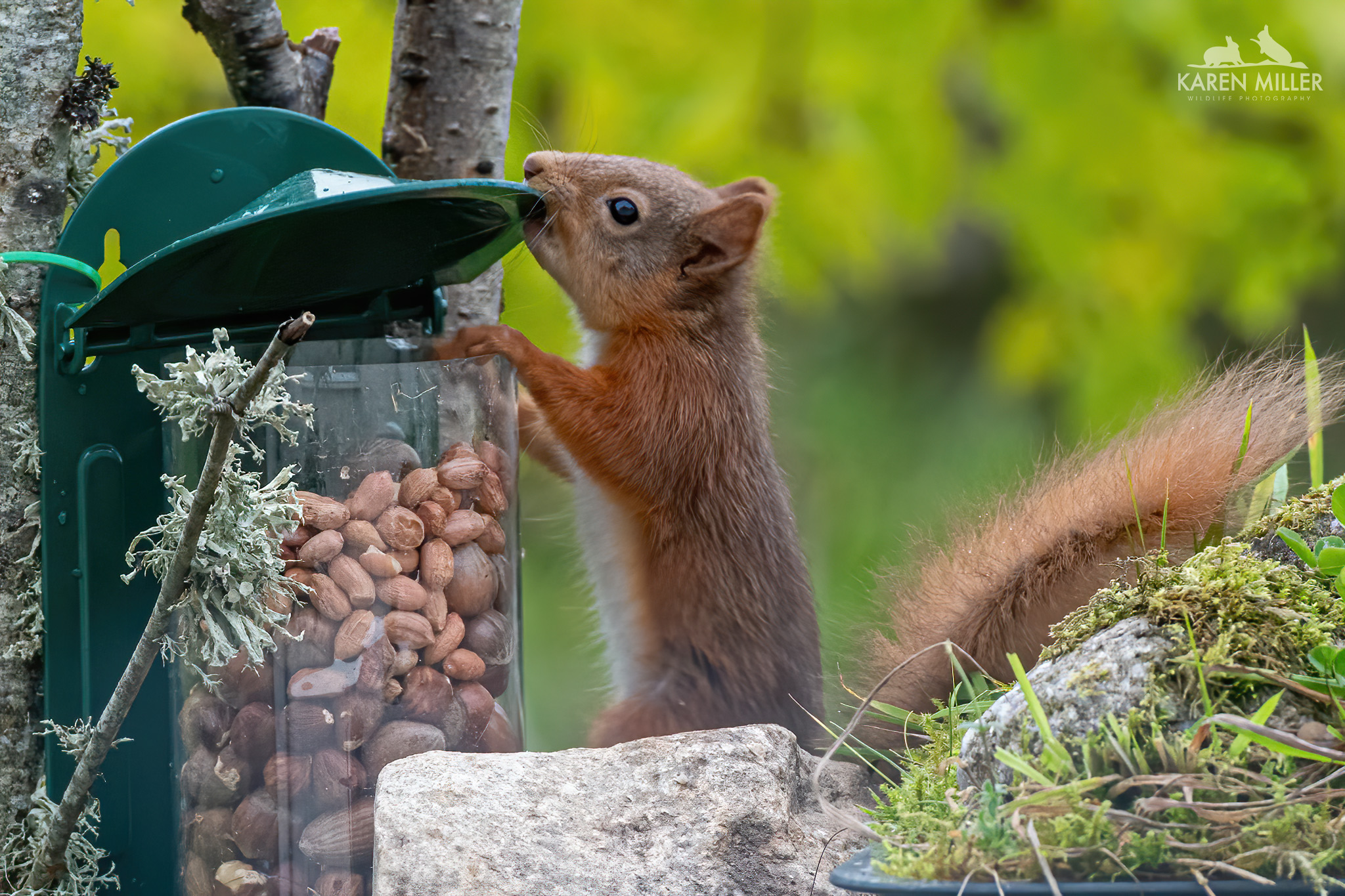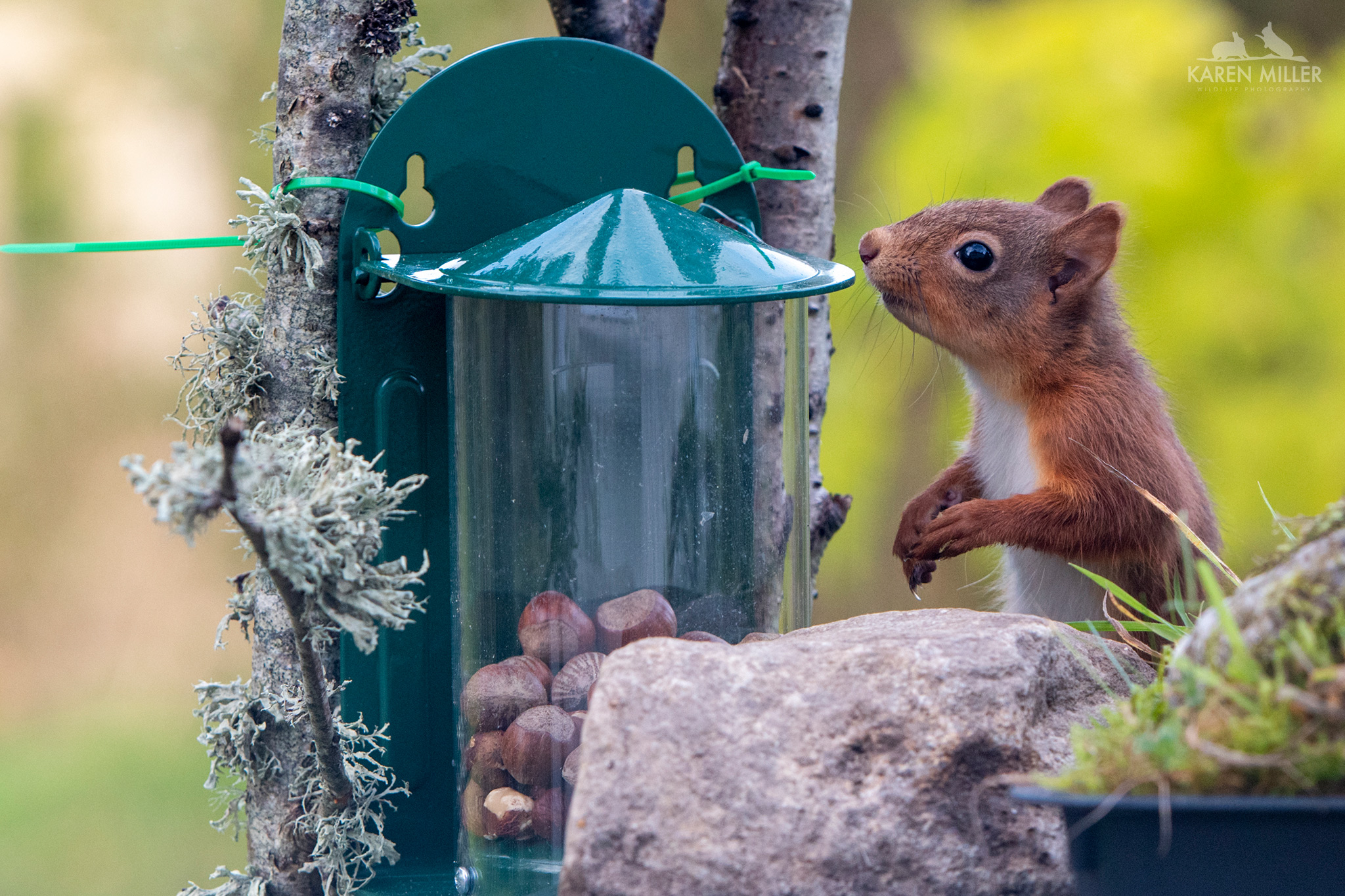 So… I went for the CJ Wildlife metal feeder. It has a few advantages over the wooden ones – it has a much lighter lid which even the kittens can open with ease and has two holes at the top both of which are designed so the feeder can be lifted off to fill/clean. It sits nicely on my feeding station table. However… it is far too deep and a little too narrow. The squirrels, even the bigger ones, have real trouble trying to get at nuts more than halfway down. Therefore I had to fill the bottom third with stones (I’m looking for something better) and put a stone, then a rock in front as the little ones just couldn’t use it properly. Fortunately they are all now fairly adept at it so long as I keep it full – not easy when they eat so many nuts!