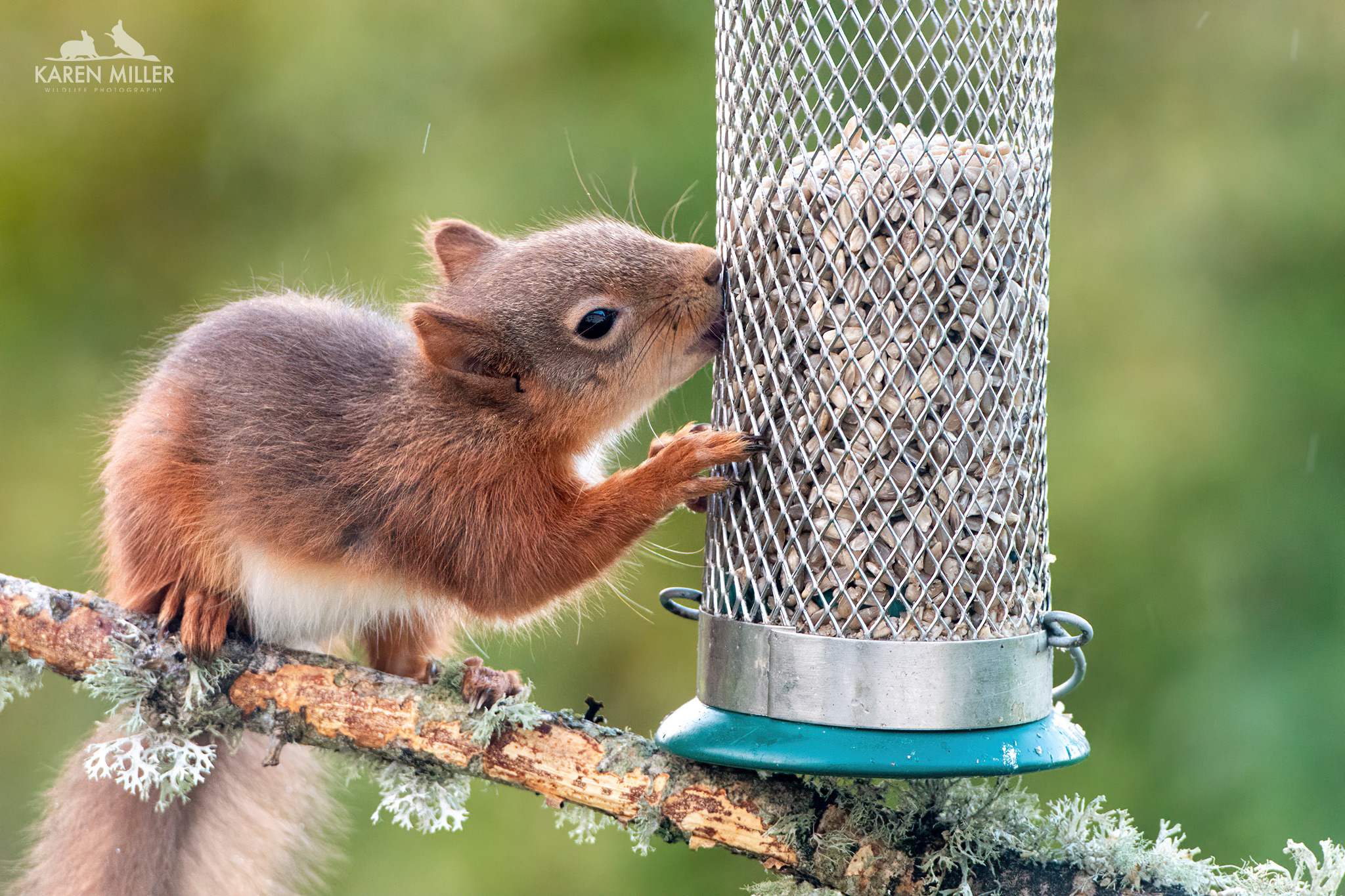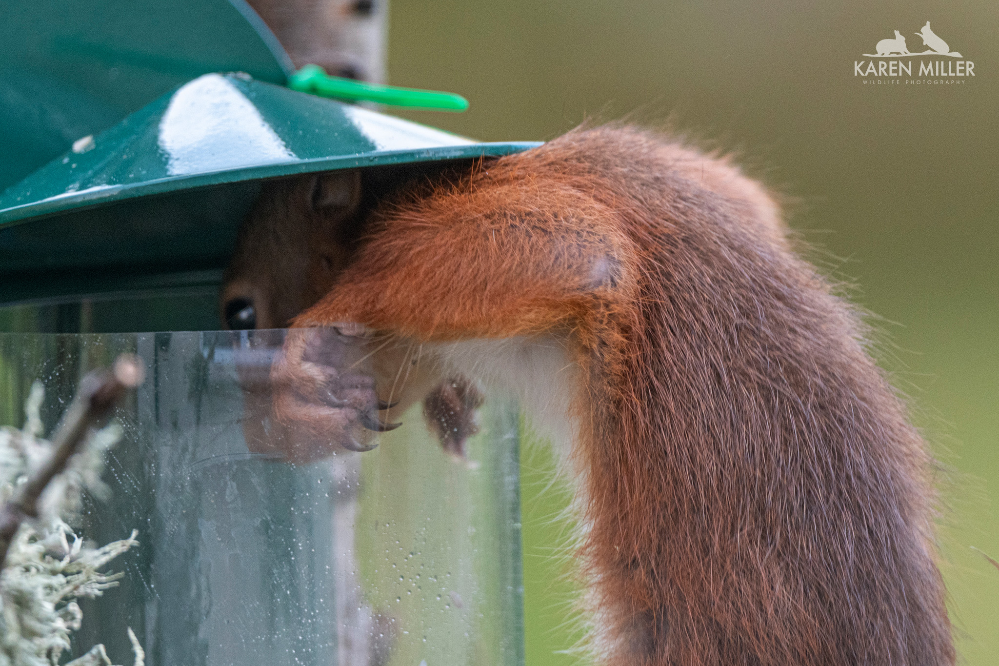 And then, suddenly, I spotted a red squirrel kitten at the feeder, which was, by this time, looking a little worse for wear. The perspex had come out and I couldn’t get it to stay in place. However I ran out and put a few hazelnuts in it and soon afterwards I saw the squirrel eating them.