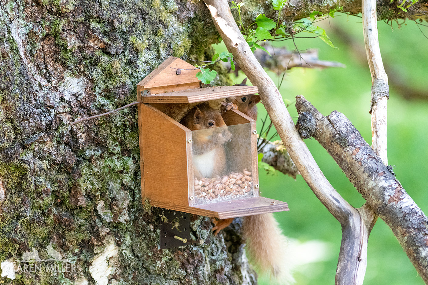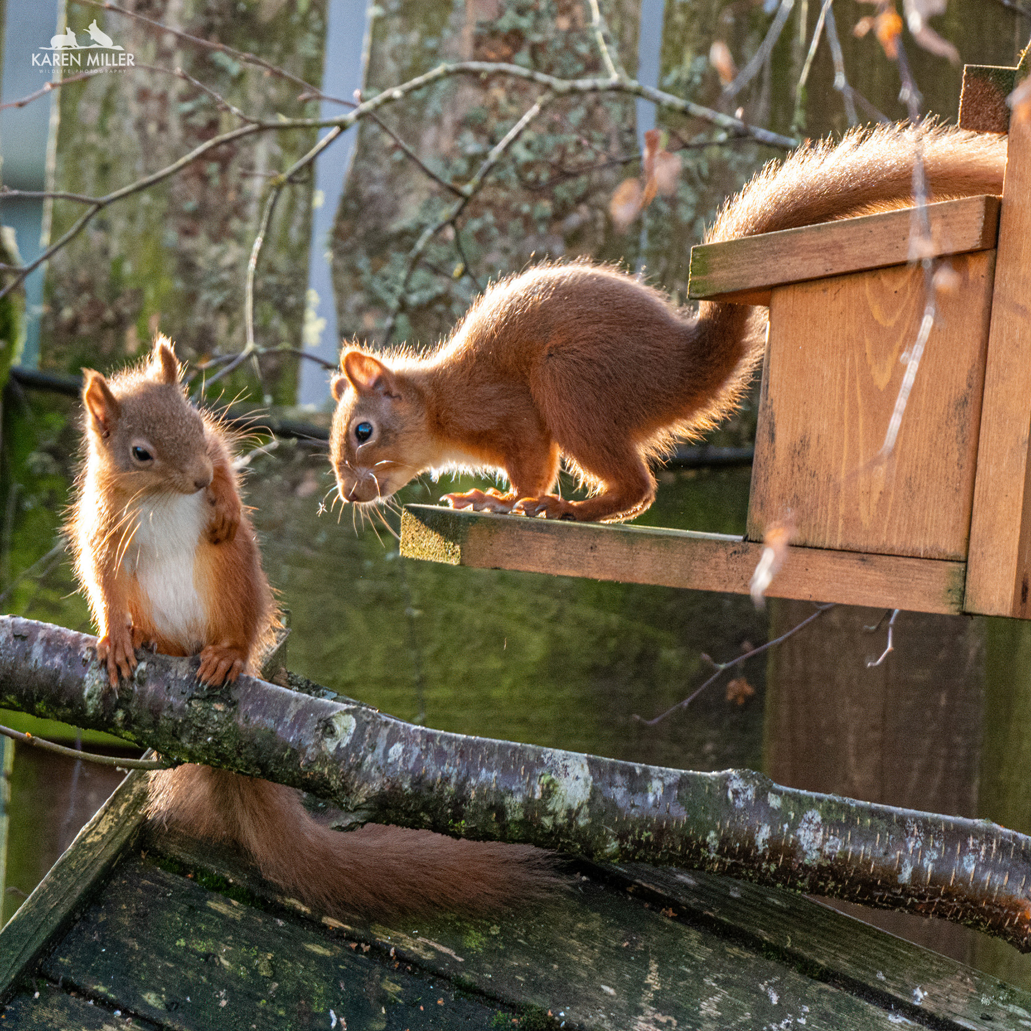 Once I saw that the squirrels were returning regularly I purchased a new feeder. Now, I’ve looked at, and used, a number of different squirrel feeders and quite frankly the perfect one has yet to be developed. The wooden one in the garden as I mentioned above has lost its perspex front and the lid is really thick and heavy. The woodland one has perspex which can only be removed with a screwdriver, also has a heavy lid and gets full of water which can’t drain away. Both of them only have one hole for a screw/nail at the top so aren’t very stable. I had to buy a bracket to attach to the bottom of the woodland one to keep it one the tree, especially given the visits by the over-enthusiastic pine martens. You can see the bracket which I (very poorly) attached below. I love this image of the two squirrels!