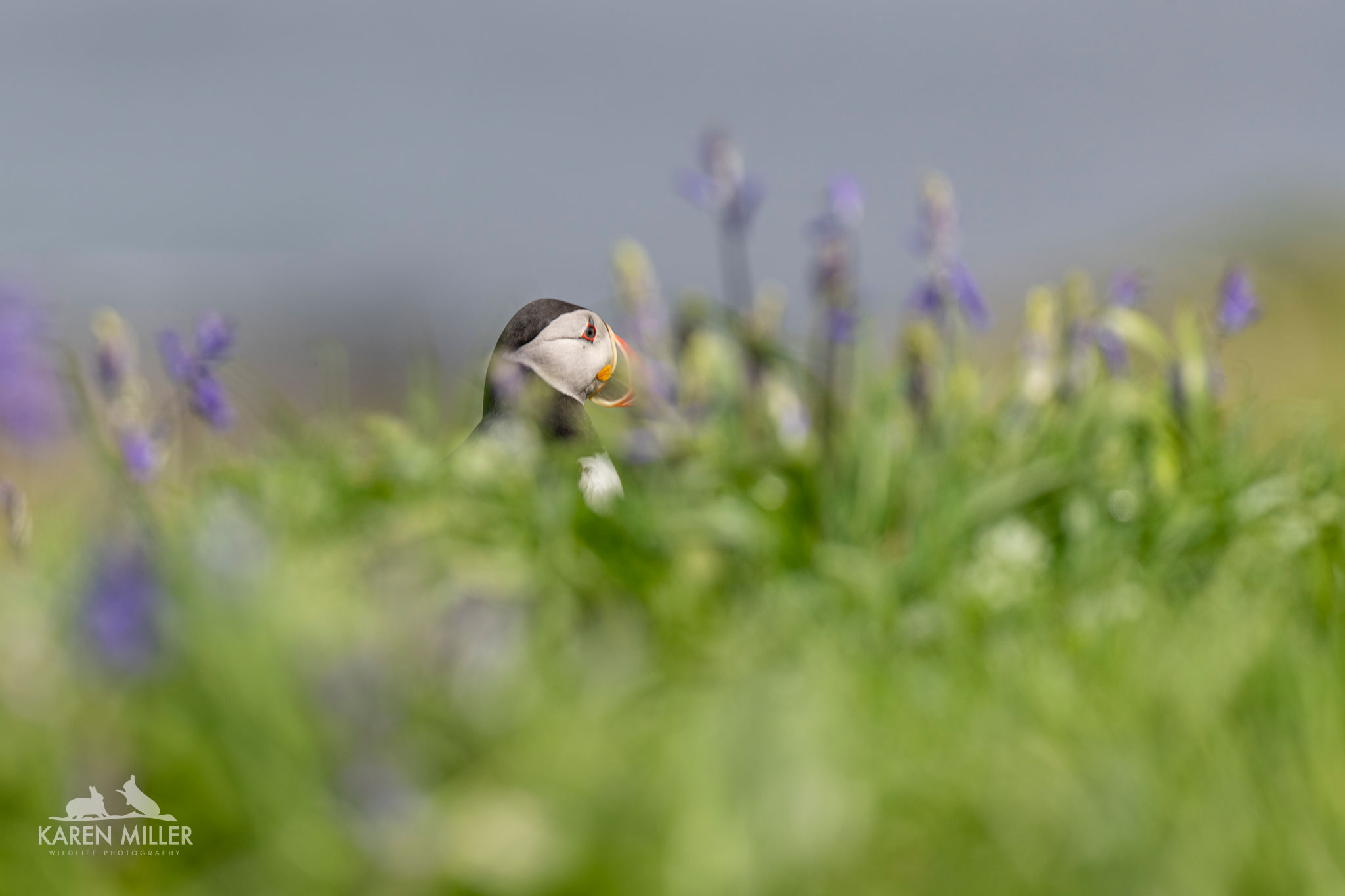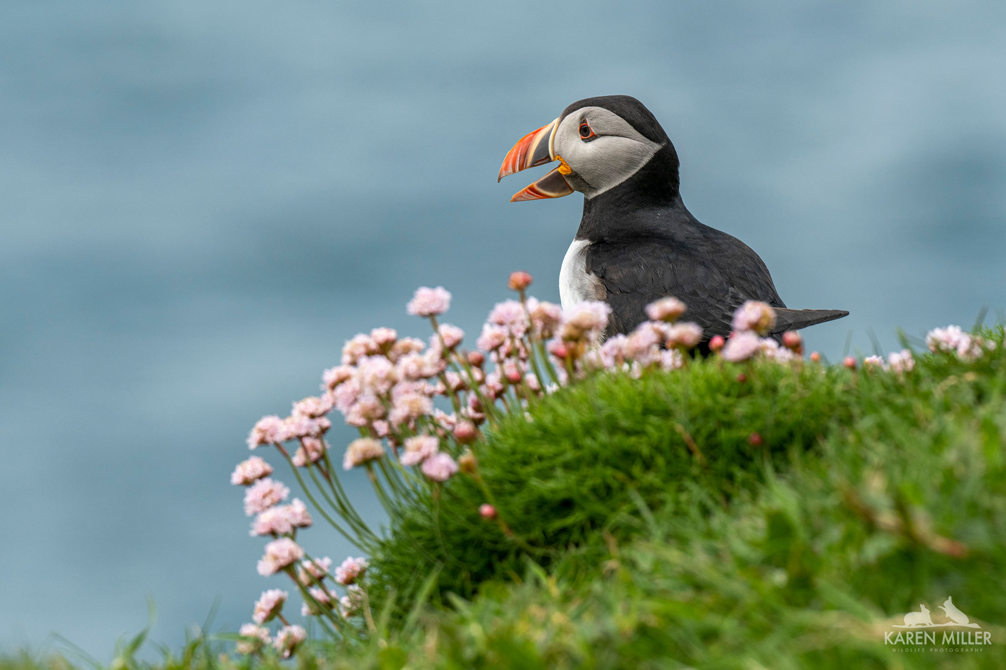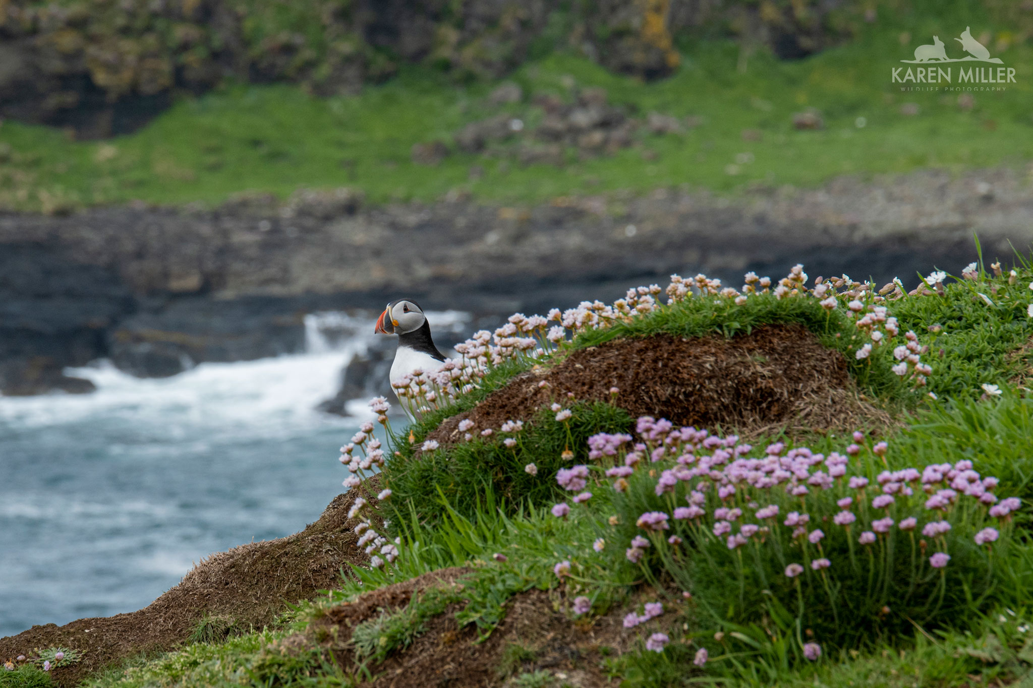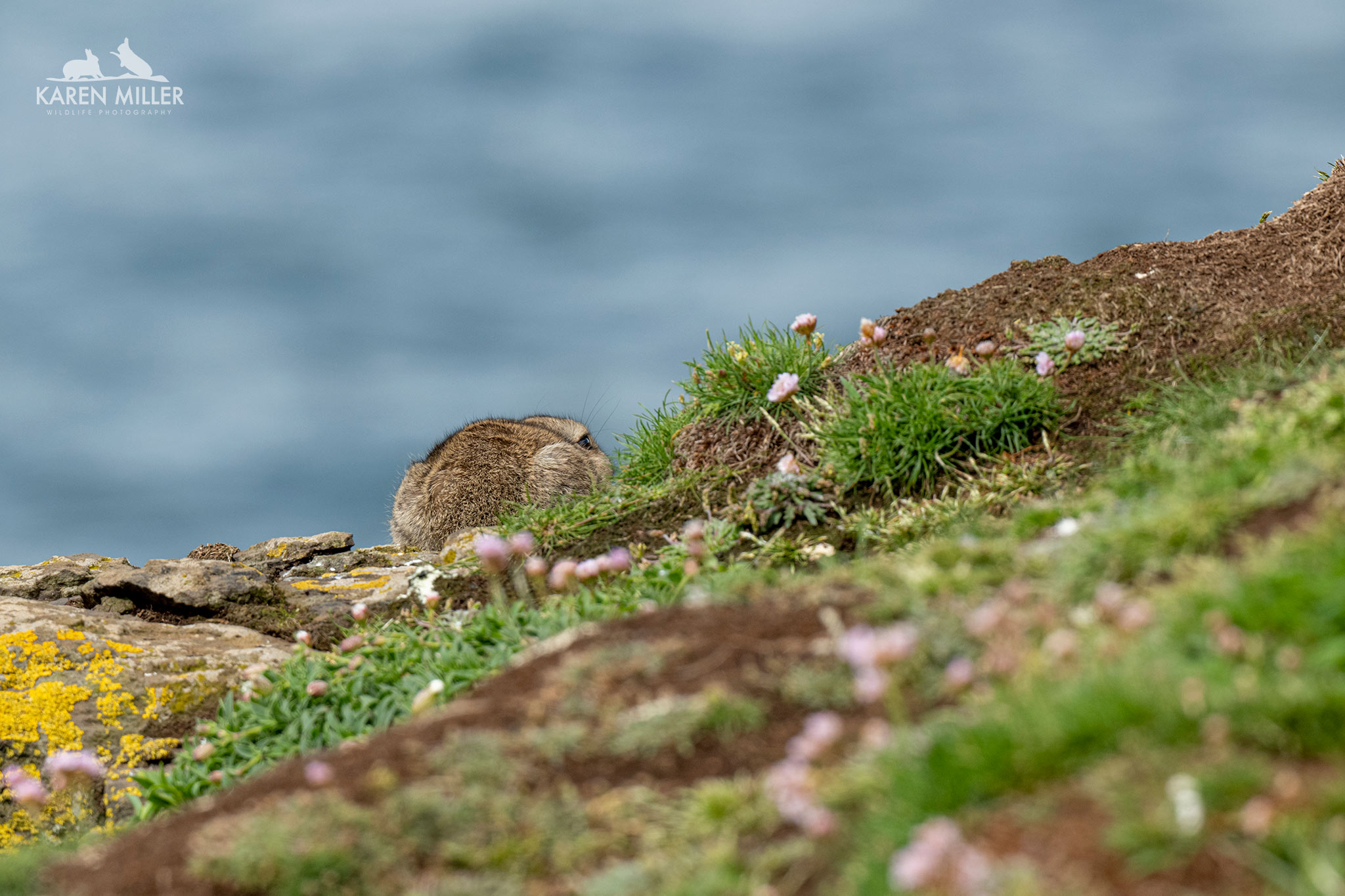 What I tend to do is find a spot at the initial cliff where there are flowers (bluebells and or sea thrift) and just wait for the puffins to go there and to exhibit behaviours such as billing, nest building and fighting. In my experience, staying in one place can give a better chance of observing all this over a period of time. That day however there weren’t very many puffins about and those that were kept disappearing due to regular fly-overs by a great skua.