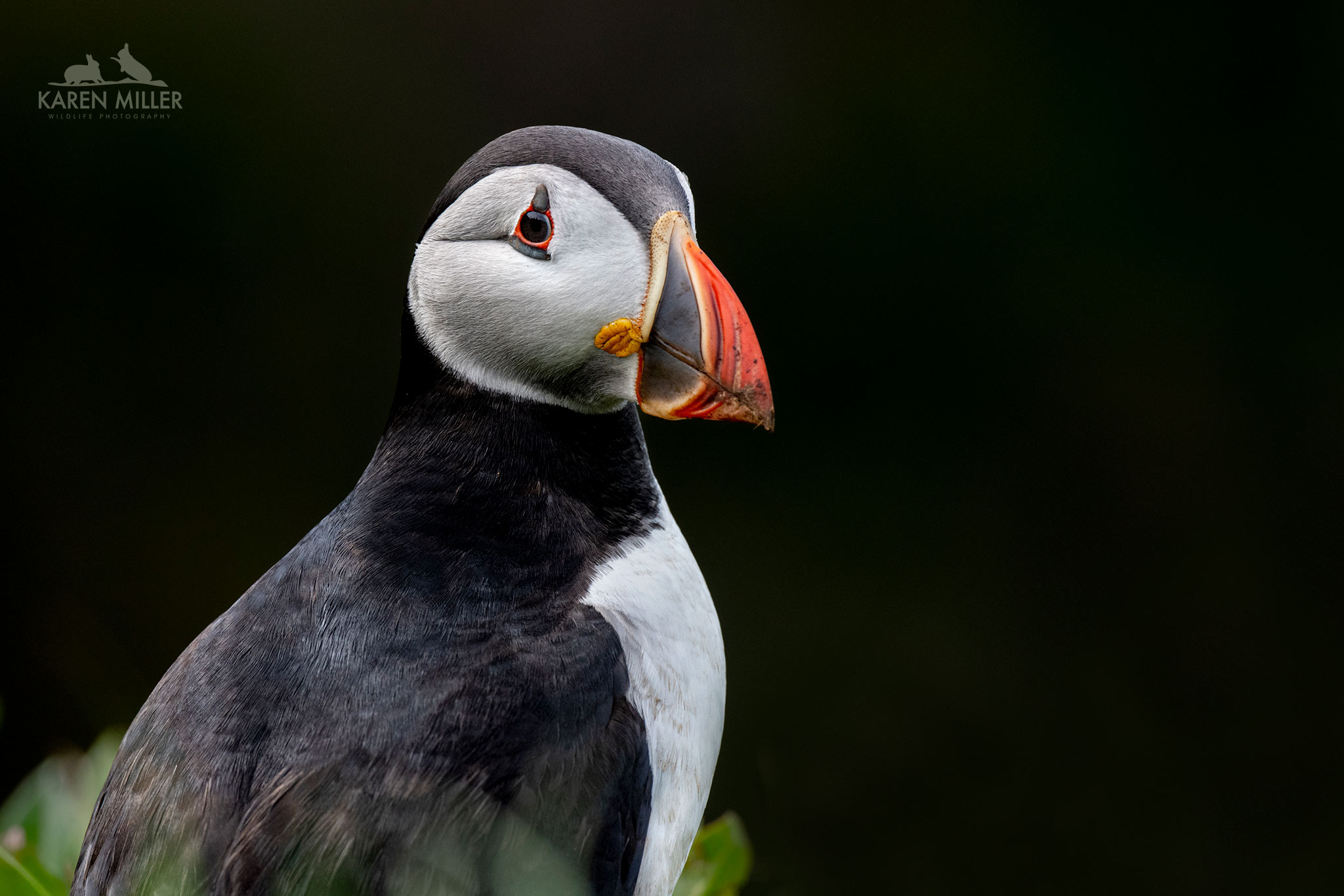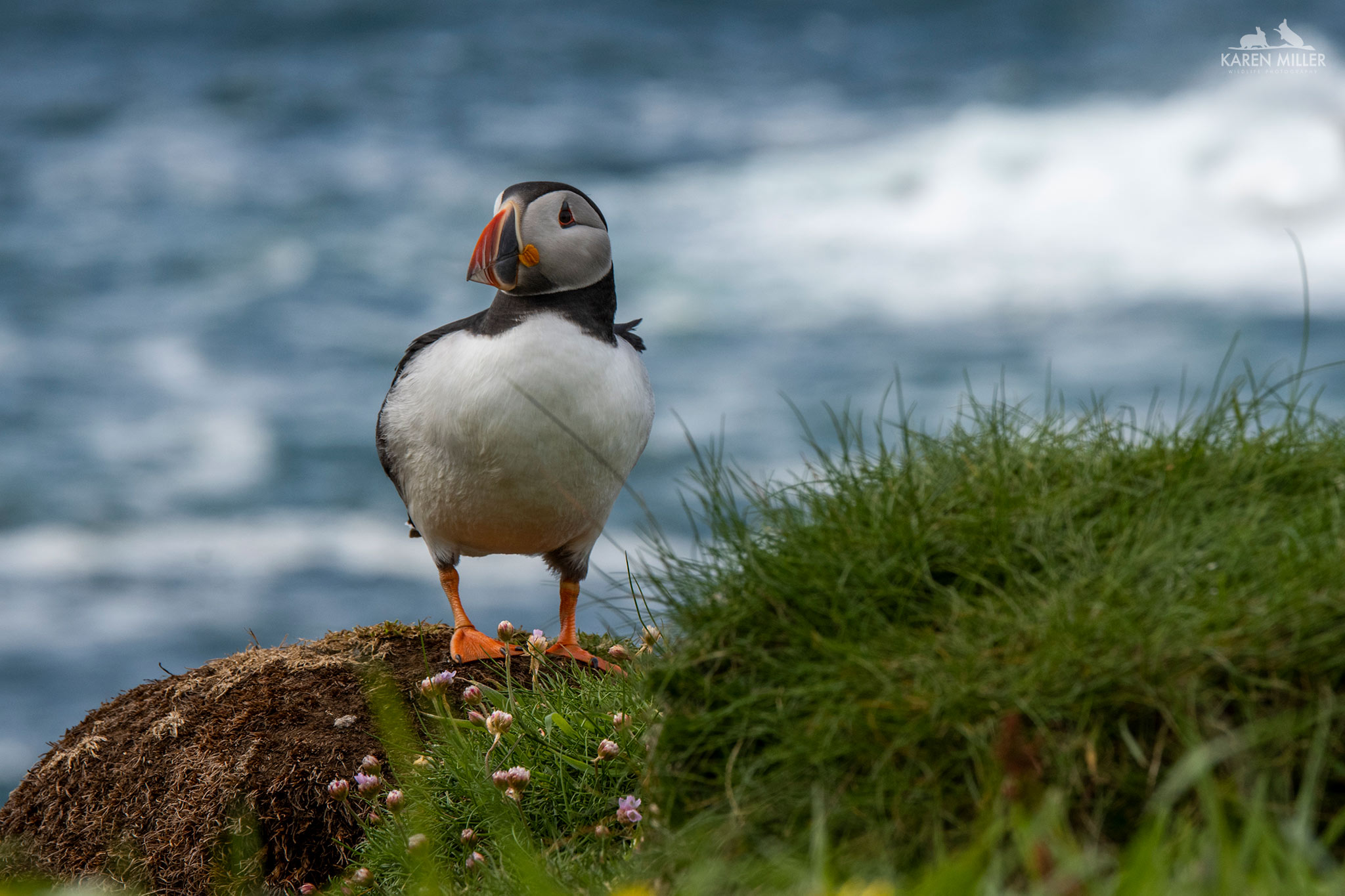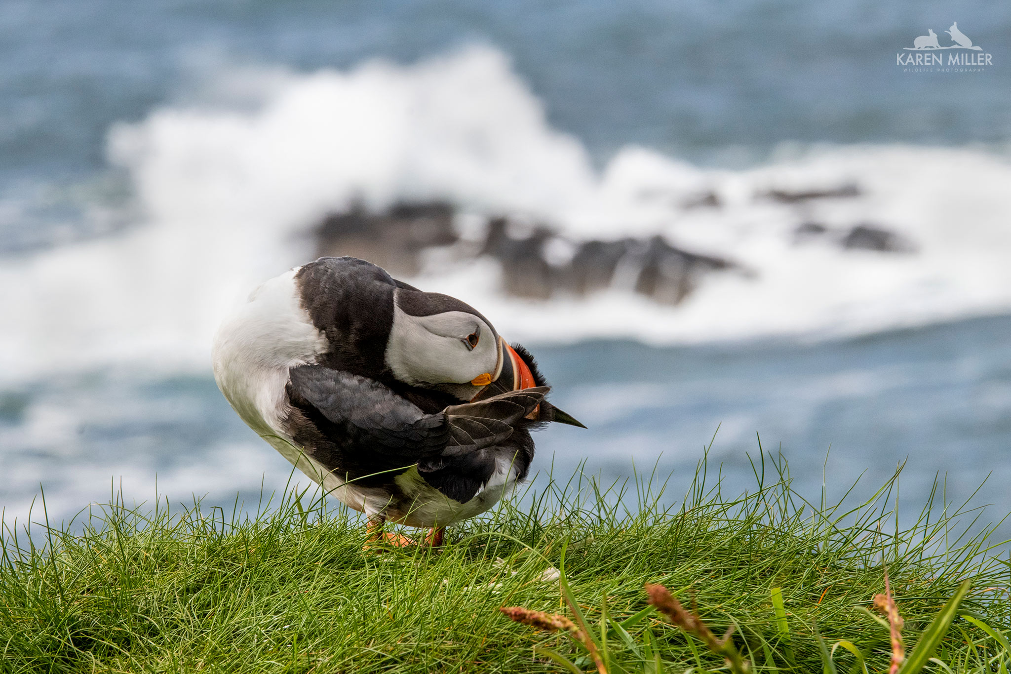 I did take a fair few portraits of the puffins here though. I liked how the wind was blowing the feathers on their cheeks. For these images, taken with my Nikon D850 and Nikkor 500mm pf5.6 lens I primarily used an aperture of f6.3-f10 and I was lying or sitting low on the ground. Being at eye level with the birds is really important. It results in significantly more engaging images than if you point the camera down at them as well as allowing for a softness in the surrounding area even at f10. The birds are close so it’s best not to use the widest aperture to ensure the whole bird is sharp (I also find that the 500mm lens is sharpest at f7.1/8). Because the birds were at the edge of the cliff the background of sea and other little islands was still blurry. It was a bright and sunny day which meant I had to be careful not to blow the highlights in the white plumage so I was deliberately under-exposing by a couple of stops (also very important!). In an ideal world it’s best to photograph puffins here (when you are going to be here in the middle of the day as opposed to early or late in the day) on a cloudy day with, at most, hazy sunshine. Unfortunately I had no choice in the matter and was just glad to make it to the island at all.