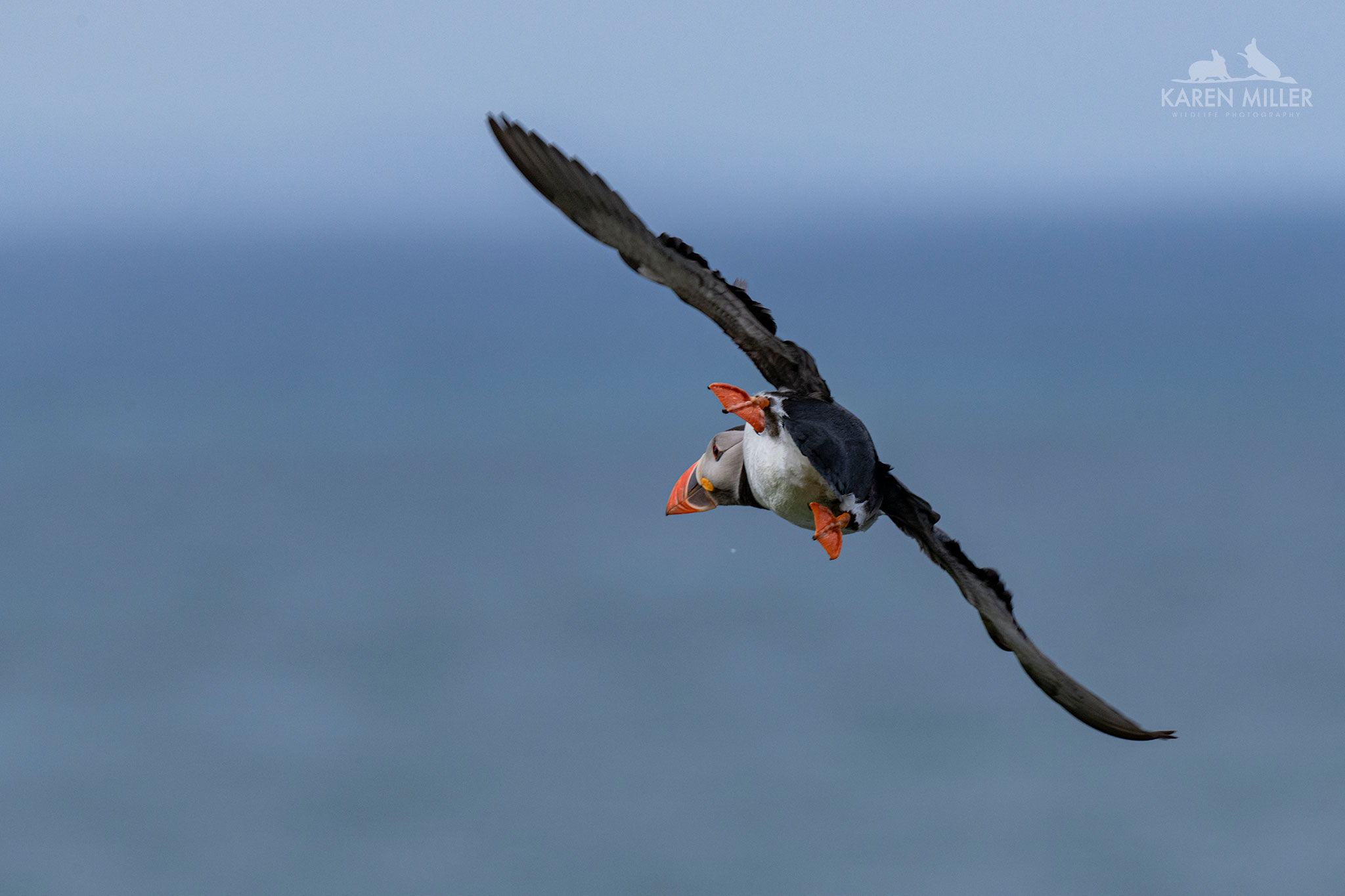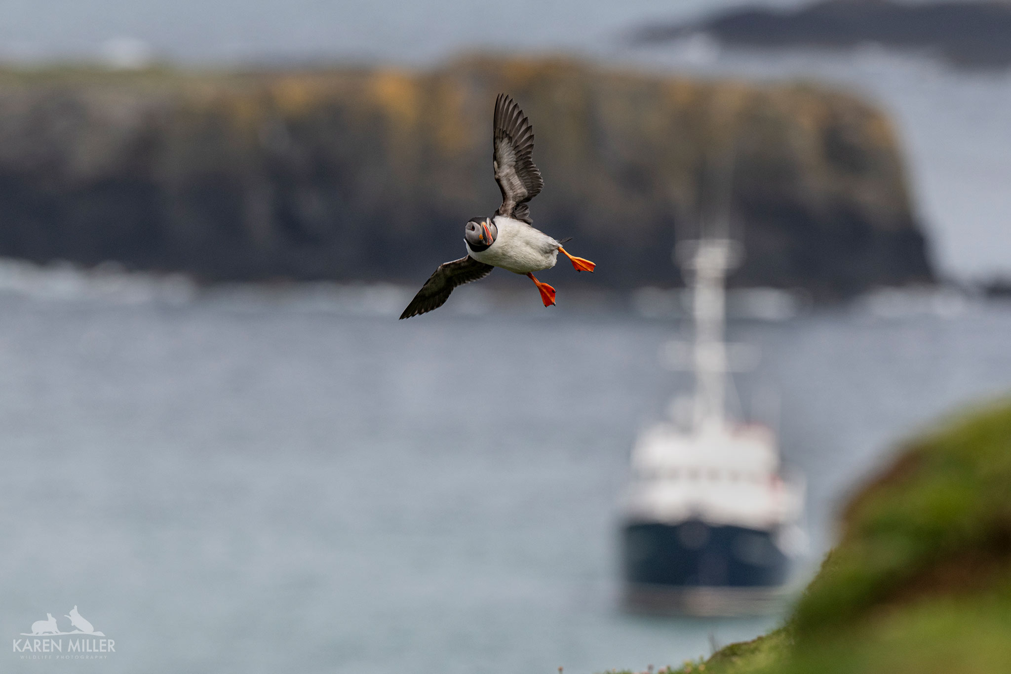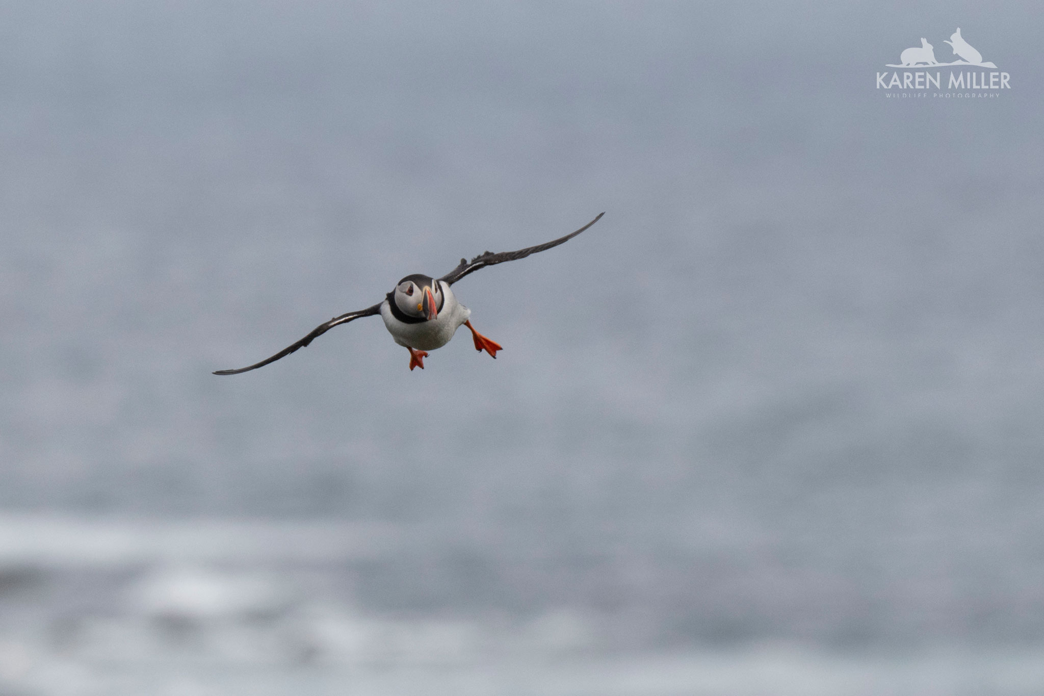 They slow down slightly as they come in to land, sticking their feet out in front of them before crashing rather inelegantly. On Lunga this can be hard to capture because they often fly below the cliff and therefore out of sight rising up to land. In this situation a lot of luck and a very quick reaction time is required to photograph. Wind is your friend here as it often means the puffin hangs in the current for a moment giving you those precious seconds to press the shutter.