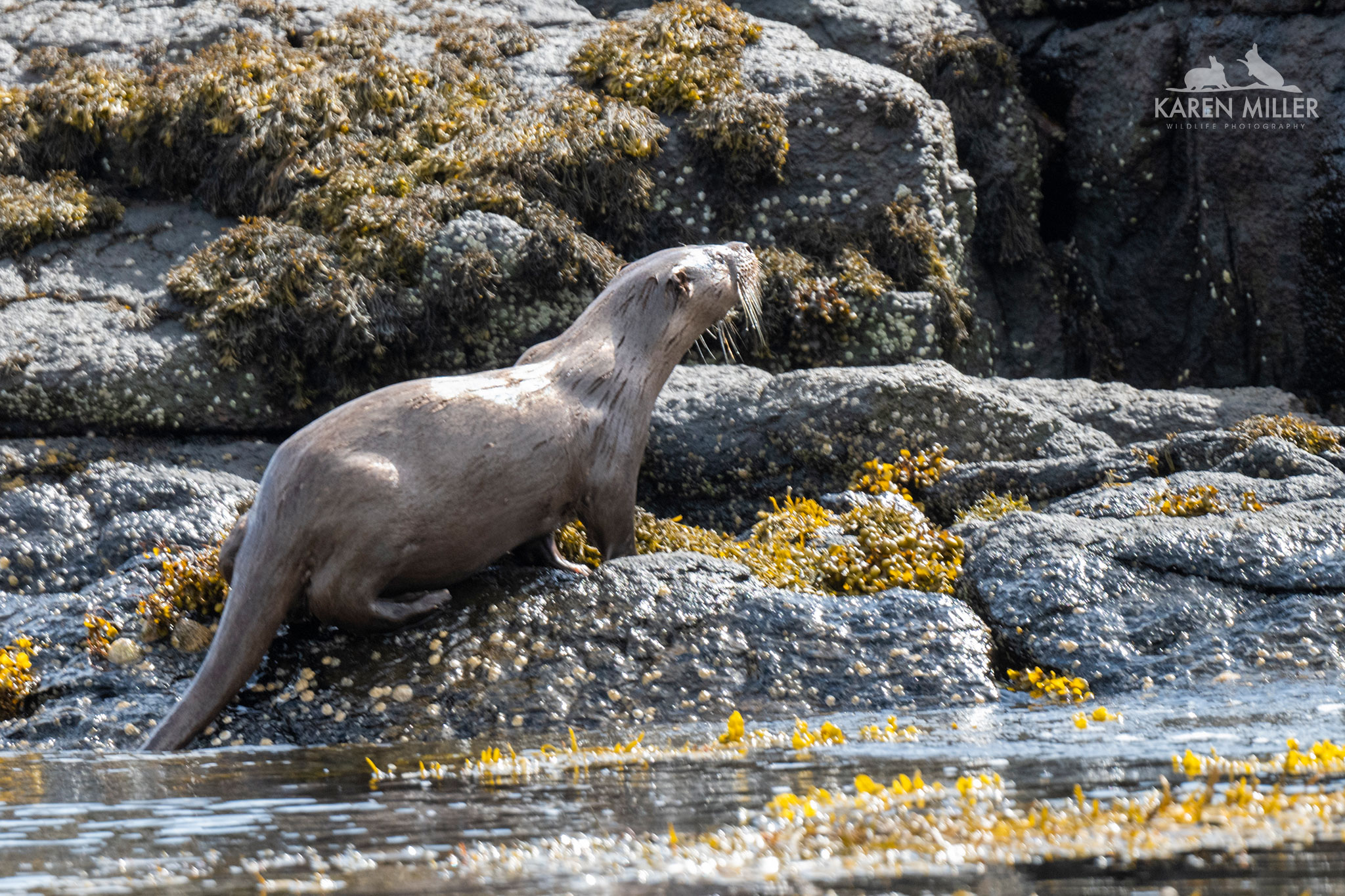 As I drove to my next destination I passed Pete Walkden, a friend who relocated to Mull last year and now runs wildlife photography workshops on the island. Lovely to see him and meet his clients, if only briefly. I then went looking for otters. The tide wasn’t great though so I only had a brief glimpse of (I think) a dog otter that had just finished eating and was heading in the wrong direction.