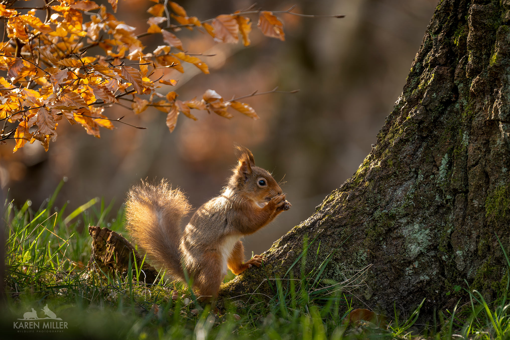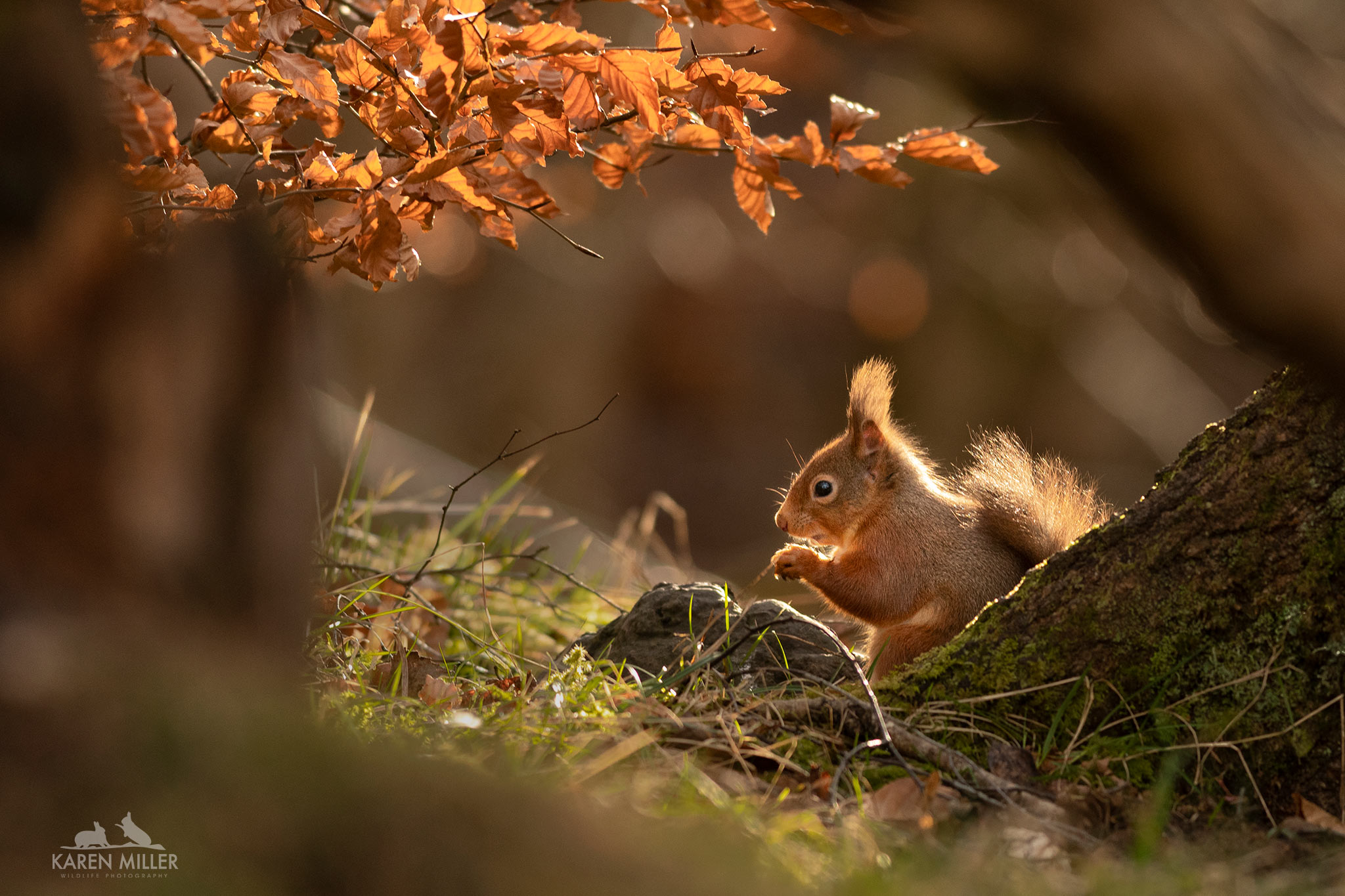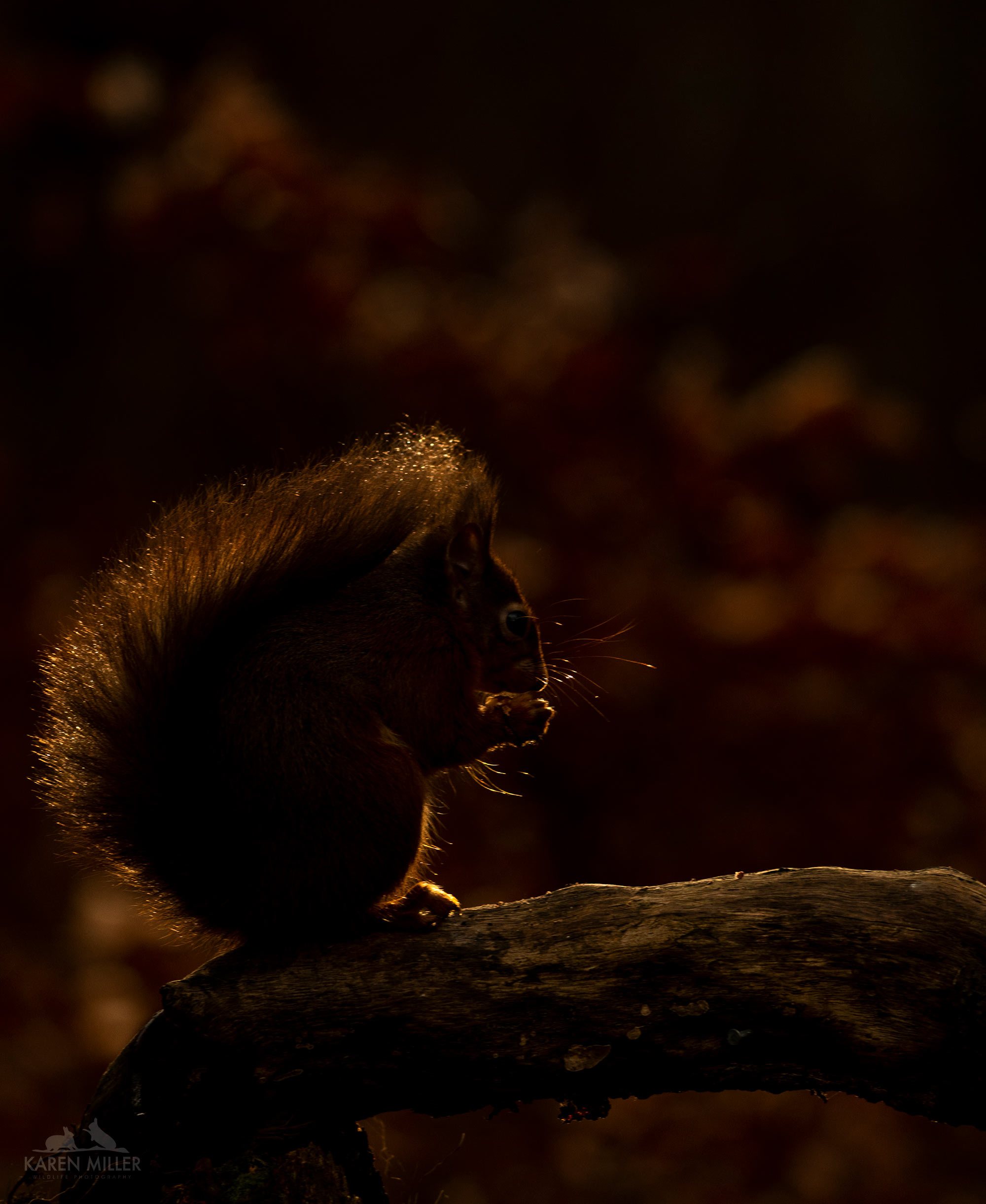 One of the main issues I have at both my red squirrel and crested tit sites over the winter months is the lack of light. The sun is so low in the sky it never gets above the treeline. However, on occasions we had some amazing light when the orange beech leaves came into their own and backlit images of the squirrels were possible.