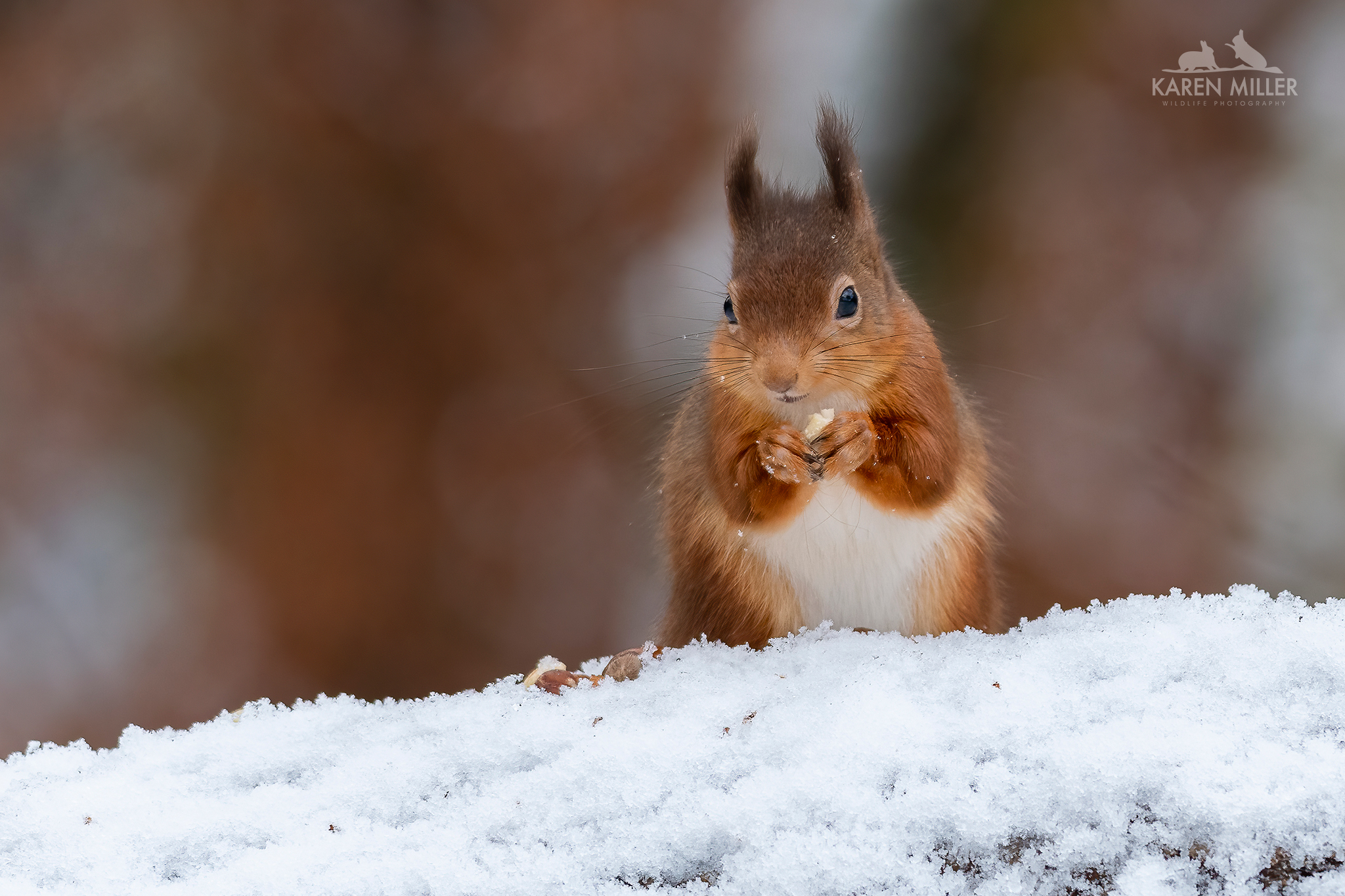 Finally on the squirrel front, my parents are lucky enough to have red squirrels visiting their garden in Perthshire all day, every day! During the winter and spring most red squirrels only leave their dreys (nests) to feed in the mornings, but these Perthshire ones are in and out constantly. It’s very distracting when I’m visiting, and I spent many an hour standing at the window watching their antics. I don’t really like photographing squirrels in a garden, preferring a more wild setting, however we had snow when I was there too, which makes a big difference.