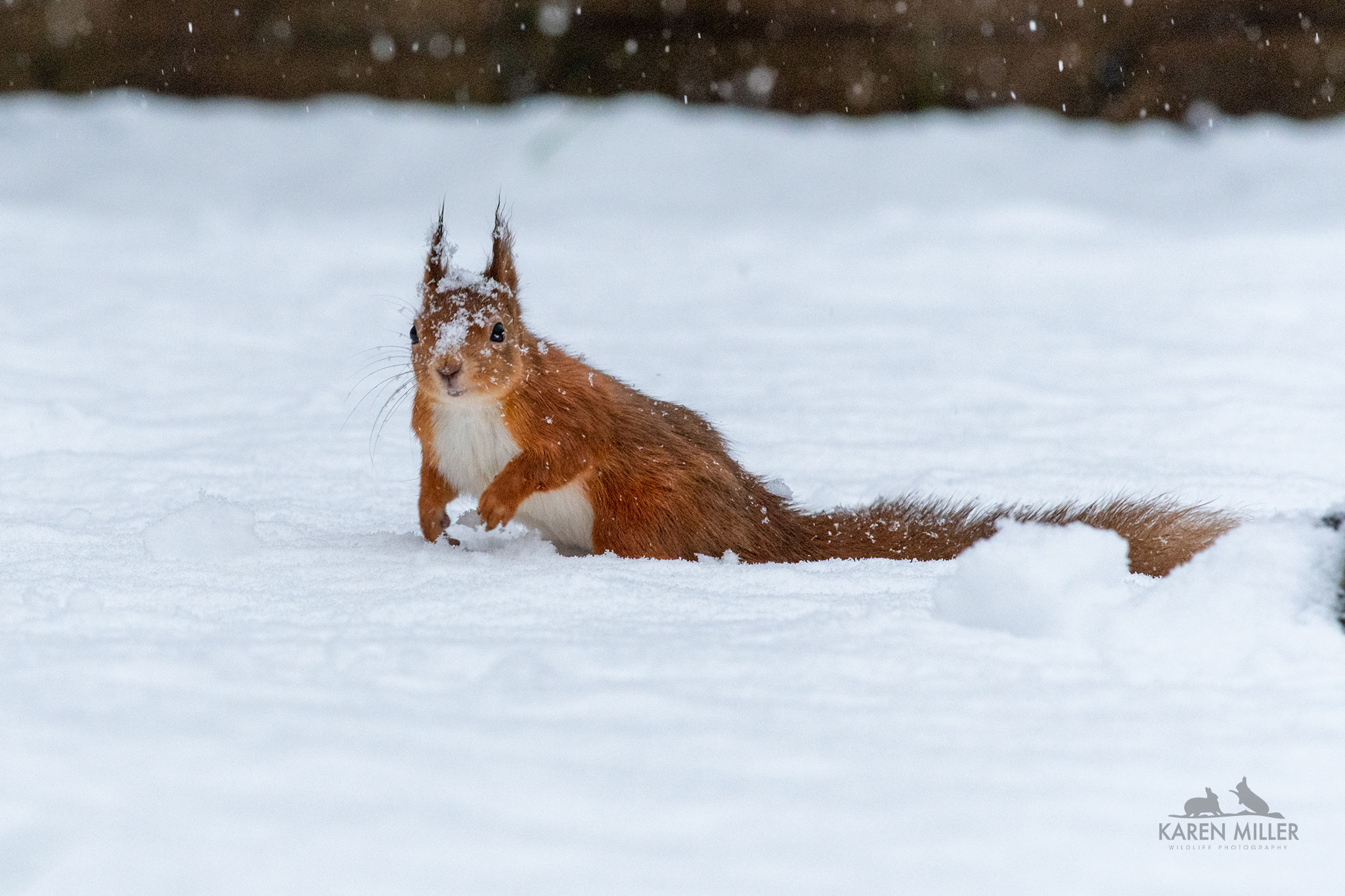 I returned from Perthshire before the New Year and was delighted to have more snow on the 1st Jan. This was the first time the autumnal kitten mentioned above braved coming in for nuts whilst I was there. He’s smaller than the others but has the most impressive tufts! His most distinguishing feature though was the fact that he had lost the top third of his tail. It must have happened very recently as the spine was still attached. He looked healthy otherwise. None of this stopped him from gathering and eating nuts that day. He was a very busy little squirrel! 1st Jan was “Bo Day” on my social media accounts (my fave mountain hare), and so the name that came to mind was Alfie. I think it suits him! On this day, he was quite nervous of the other squirrels, looking around him with the worried stance (paws clutched to chest) but seemed relaxed in my presence. I confess I was concerned for him as squirrels use their tails for all sorts of things such as communication, balance, sun shade, umbrella and warmth. But he seems to be thriving which is a relief.