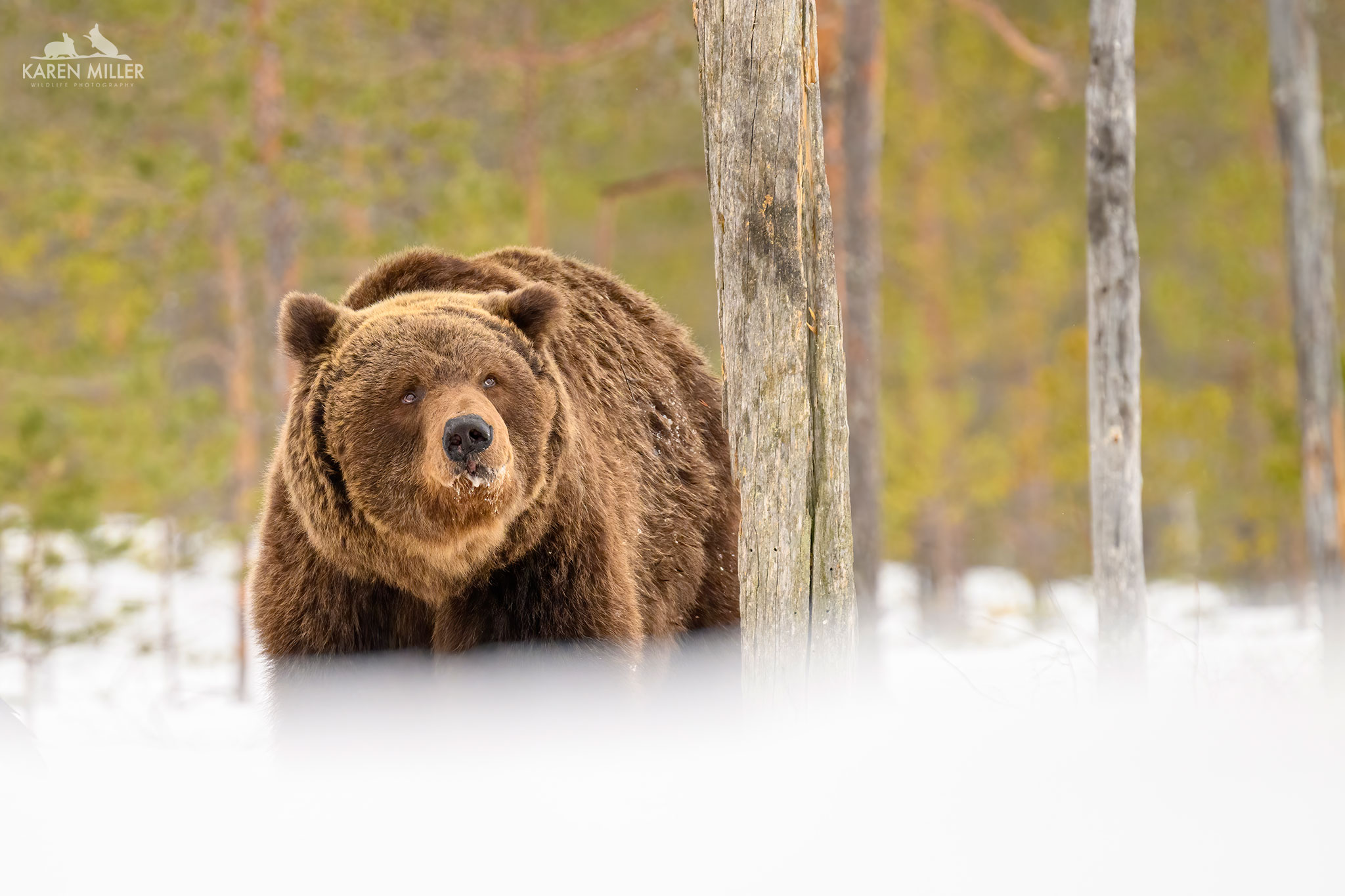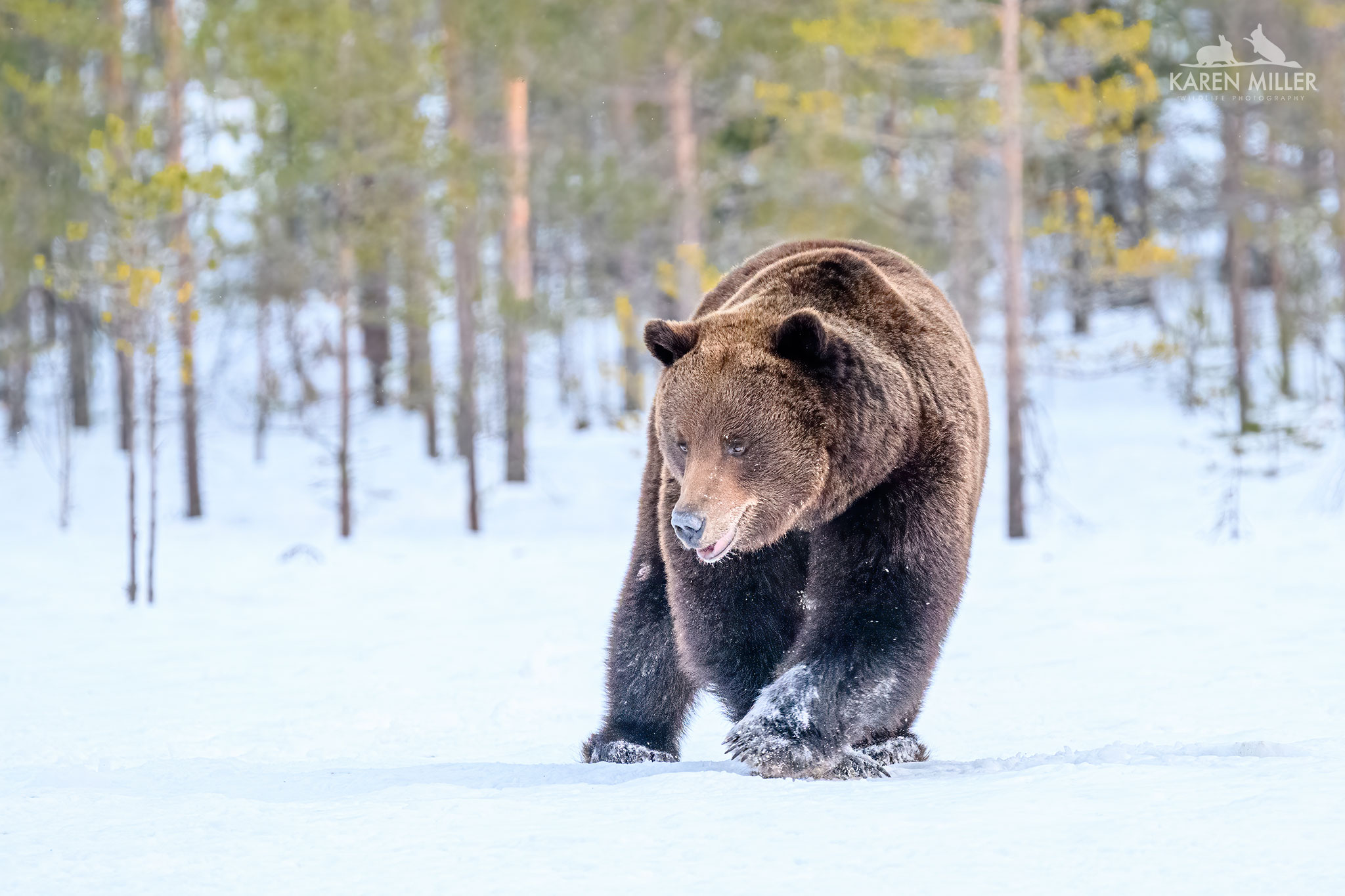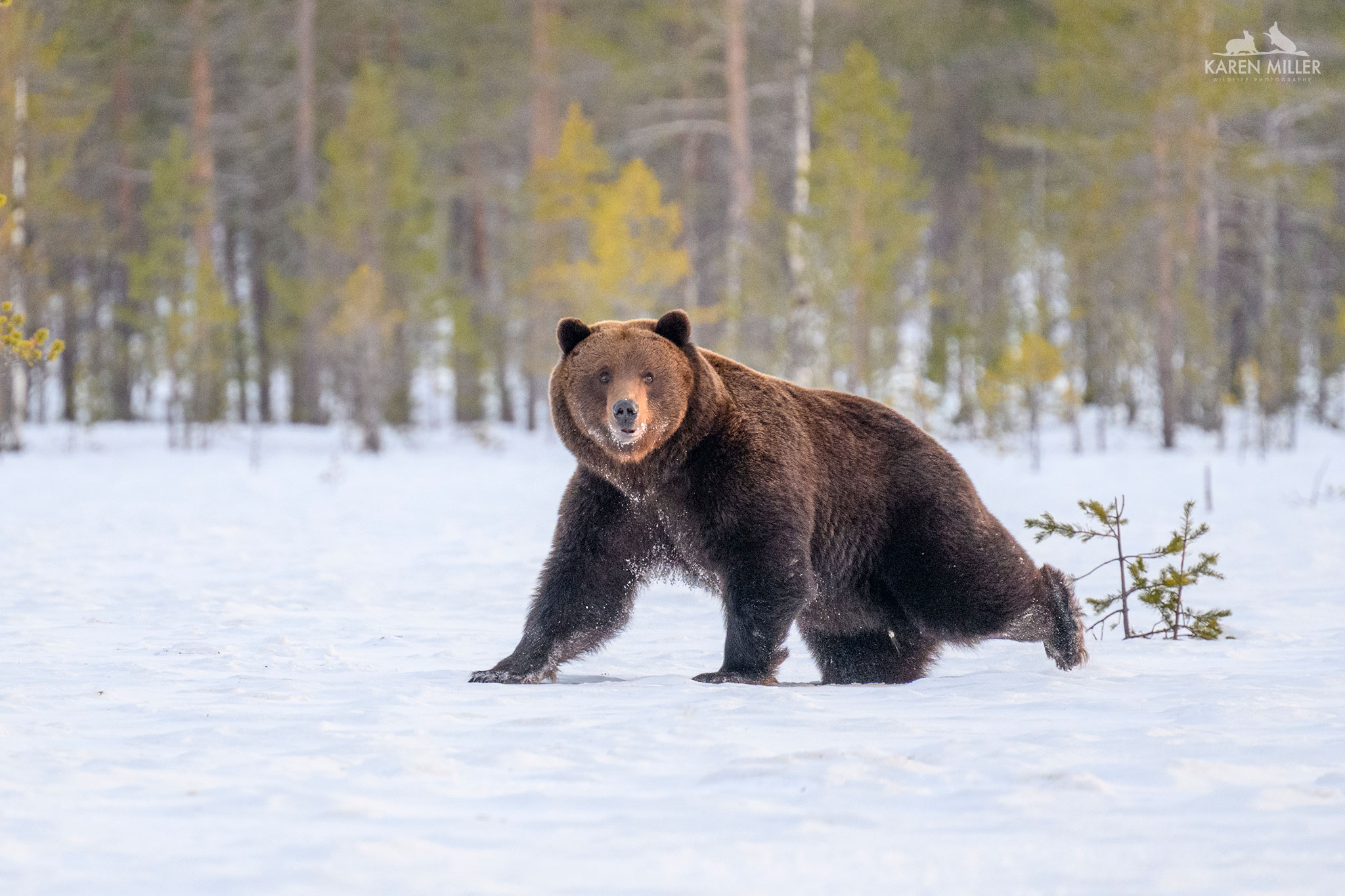 Brown bears were our target species at the Boreal centre. Arguably, the prettiest of all the bears appeared on our first evening in the hide. He was a real teddy bear. He too approached from the far right and really struggled to walk through the snow, sinking deep into it with every footstep.