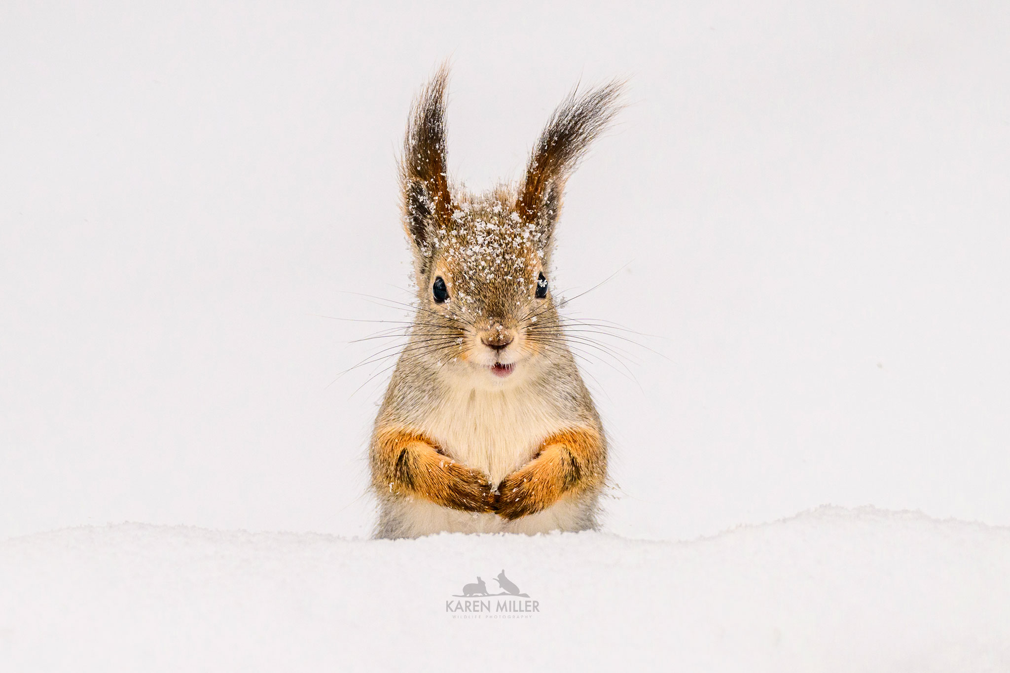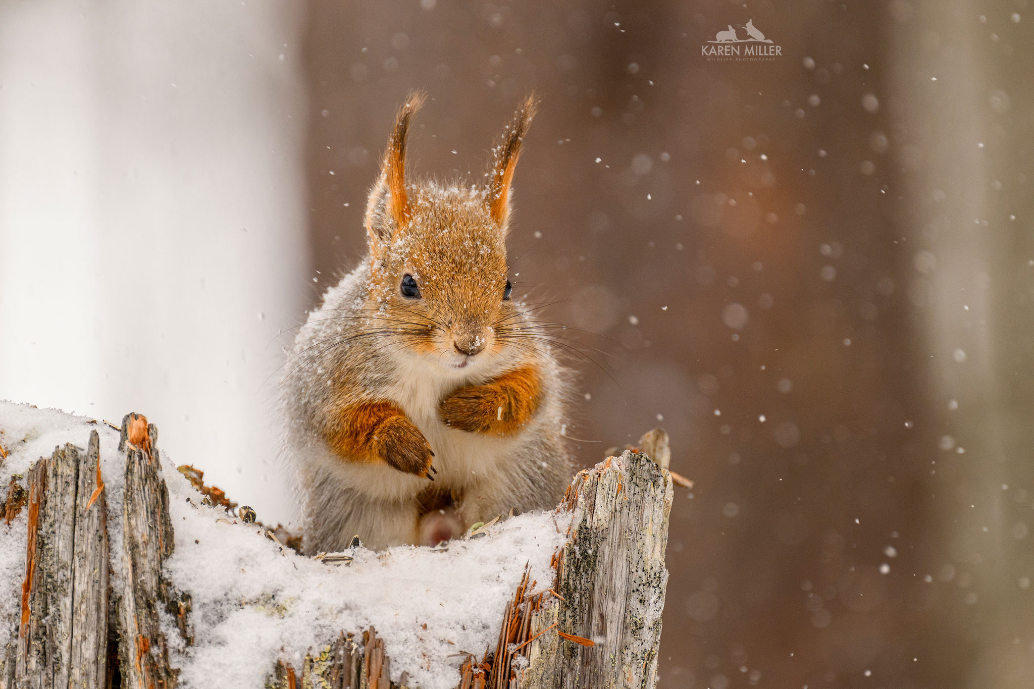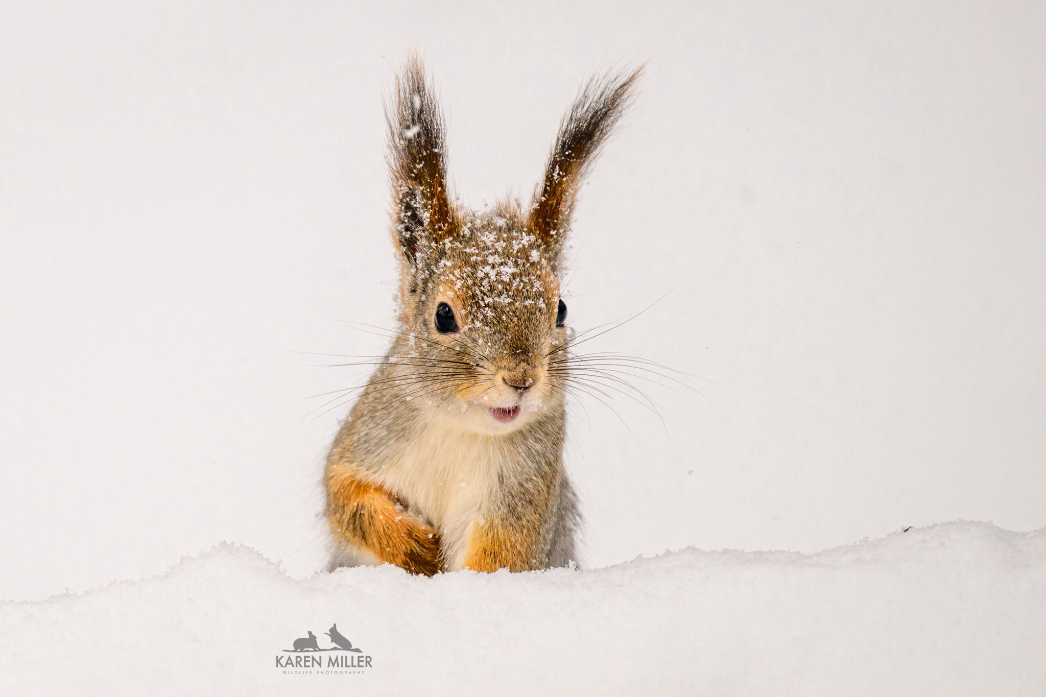 The other mammal we photographed at the Boreal Centre was one I’m very familiar with – the red squirrel. Most of the red squirrels in the UK, except the island based populations, are actually descended from Scandinavian red squirrels and they are almost identical to look at… except for their much longer ear tufts. There’s a bird hide at the centre and I spent a few hours there over a couple of mornings watching the birds and hoping for squirrel sightings. On my first morning, one came in, but it sat amongst bird seed on the ground and although great to see, it wasn’t photogenic. A few tweaks to the hide and heavy snow improved things dramatically for my second visit. We had two squirrels come in for a long period. The first one was initially obscured behind a snow-covered log, with only the tufts showing. It did eventually give more photographic opportunities though and it was absolutely gorgeous.