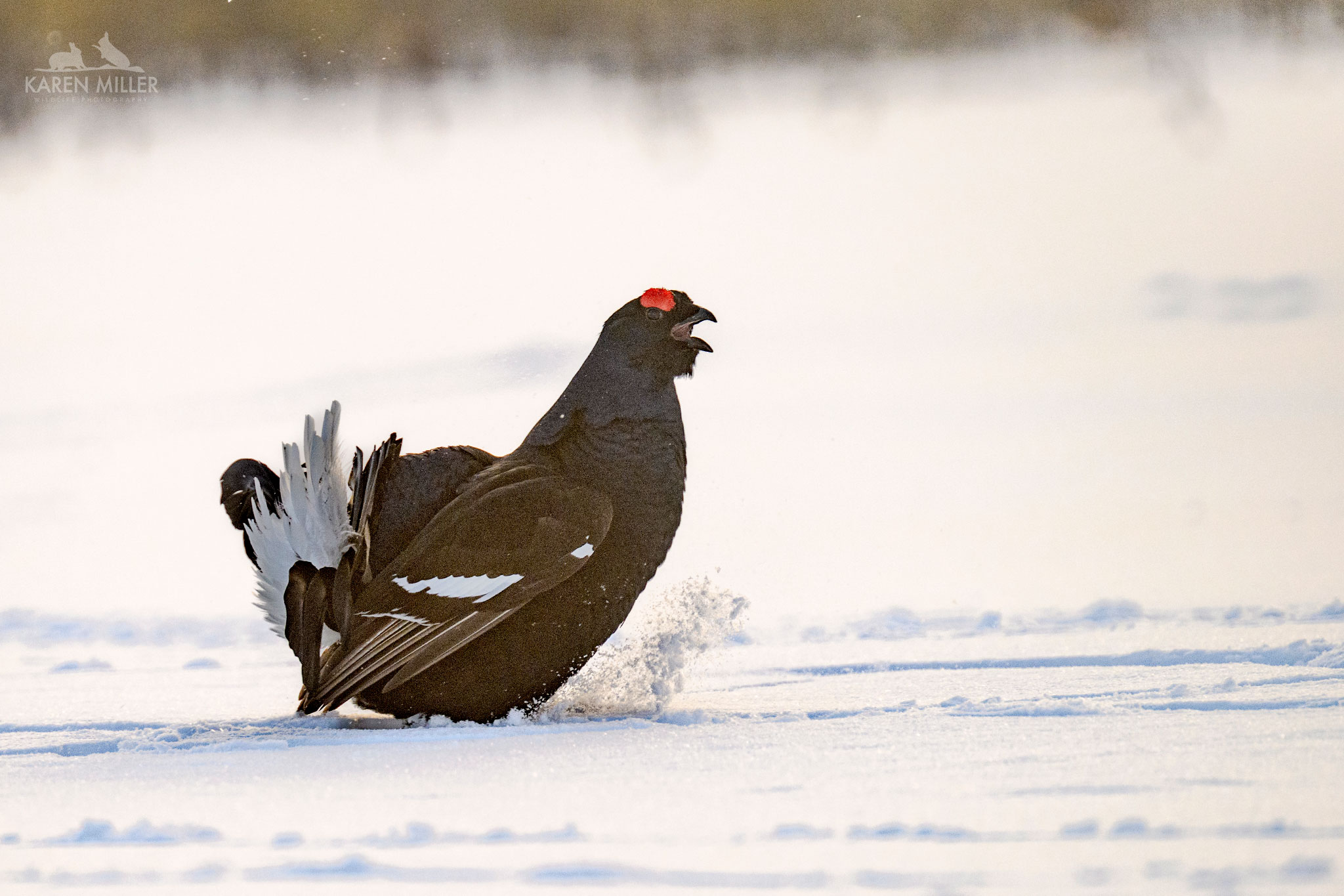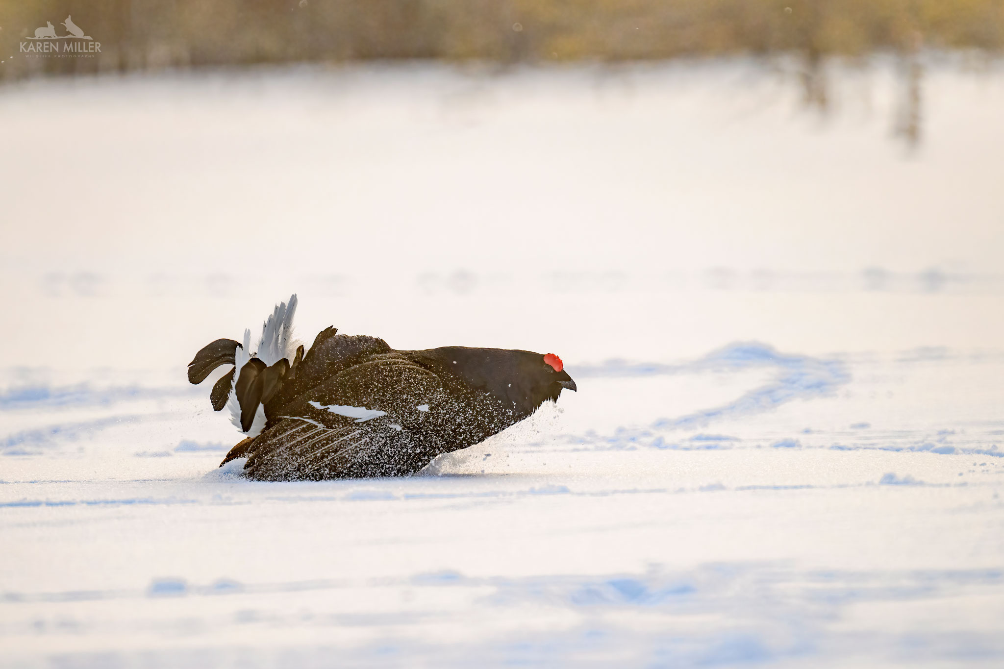 It was hilarious watching the cocks strut around, the females didn’t look very impressed. I didn’t manage to photograph successfully many fights as the snow got in the way as did a bush they decided to fight within – typical!