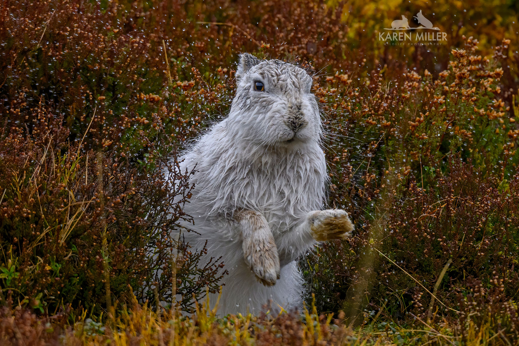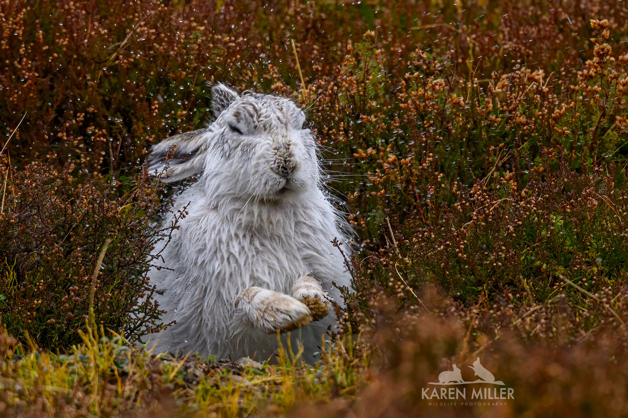 The species almost everyone wishes to see are the mountain hares. A favourite of mine too. Very little in the way of snow, and plenty in the way of gale force winds! If there’s no snow it doesn’t look as great, so a second best weather condition was rain. I dragged my poor clients there on the wettest days, but I think they all approved of my decision after seeing the hares shaking off the rain and looking very bedraggled (just like us!). Quite a few of these ones (all except the first three) are of favourite hare Bo. More about her later…