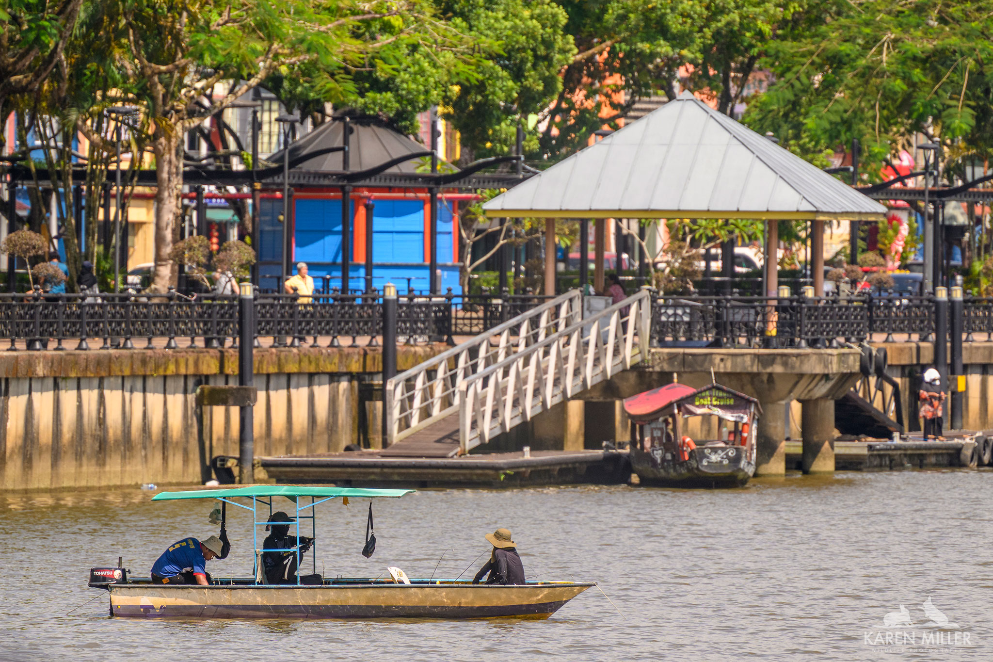 Taxi boats travel back and forwards across it and a few men fish both from boats and the shore.
